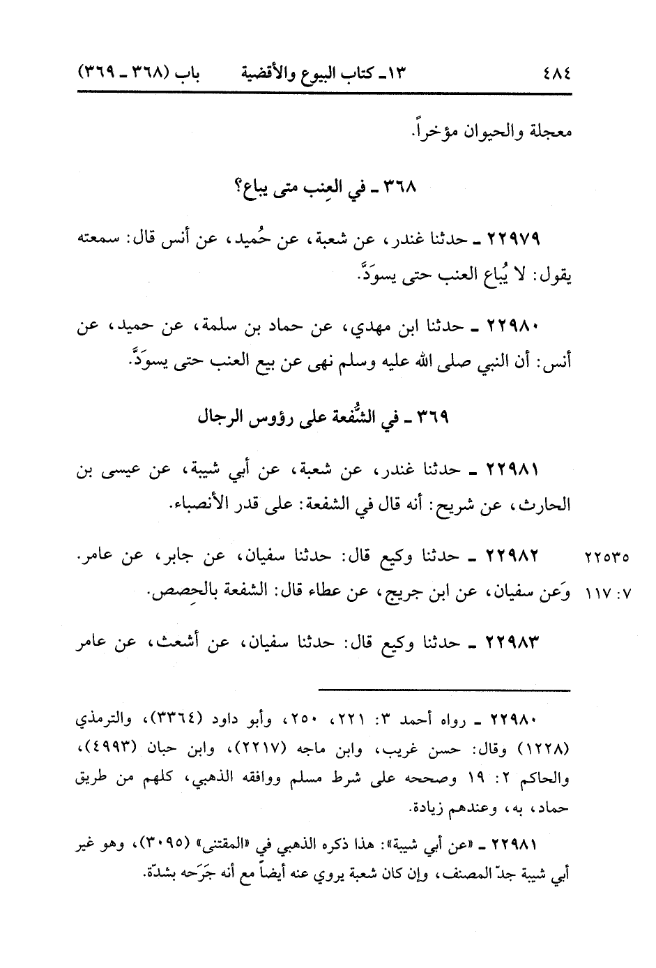 22979- حَدَّثَنَا غُنْدَرٌ ، عَنْ شُعْبَةَ ، عَنْ حُمَيْدٍ ، عَنْ أَنَسٍ ، قَالَ : سَمِعْتُهُ يَقُولُ : لاَ يُبَاعُ الَعَنَبُ حَتَّى يَسْوَدَّ.