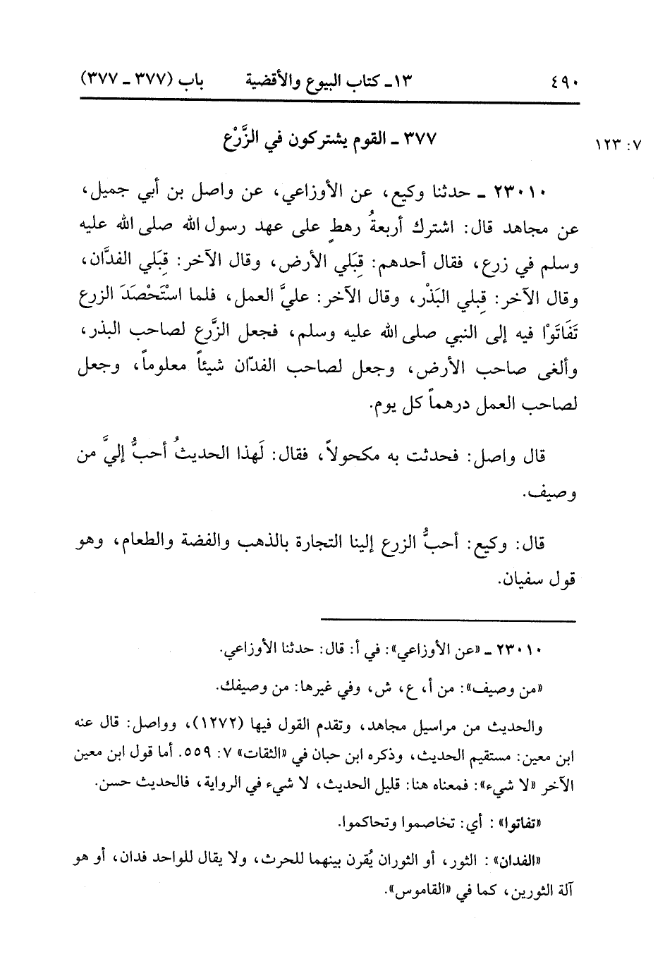 23010- حَدَّثَنَا وَكِيعٌ ، عَنِ الأَوْزَاعِيِّ ، عَنْ وَاصِلِ بْنِ أَبِي جَمِيلٍ ، عَنْ مُجَاهِدٍ ، قَالَ : اشْتَرَكَ أَرْبَعَةُ رَهْطٍ عَلَى عَهْدِ رَسُولِ اللهِ صَلَّى الله عَلَيْهِ وَسَلَّمَ فِي زَرْعٍ ، فَقَالَ أَحَدُهُمْ : قِبَلِي الأَرْضُ ، وَقَالَ الآخَرُ : قِبَلِي الْفَدَّانُ ، وَقَالَ الآخَرُ : قِبَلِي الْبَذْرُ ، وَقَالَ الآخَرُ : عَلَيَّ الْعَمَلُ ، فَلَمَّا اسْتَحْصَدَ الزَّرْعُ تَفَاتَوْا فِيهِ إلَى النَّبِيِّ صَلَّى الله عَلَيْهِ وَسَلَّمَ فَجَعَلَ الزَّرْعَ لِصَاحِبِ الْبَذْرِ ، وَأَلْغَى صَاحِبَ الأَرْضِ ، وَجَعَلَ لِصَاحِبِ الْفَدَّانِ شَيْئًا مَعْلُومًا ، وَجَعَلَ لِصَاحِبِ الْعَمَلِ دِرْهَمًا كُلَّ يَوْمٍ ، قَالَ وَاصِلٌ : فَحَدَّثْت بِهِ مَكْحُولاً ، فَقَالَ : لَهَذَا الْحَدِيثُ أَحَبُّ إلَيَّ مِنْ وَصَيْفٍ.