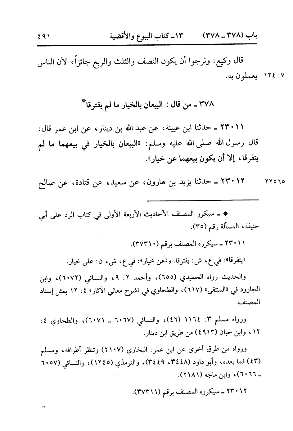 23011- حَدَّثَنَا ابْنُ عُيَيْنَةَ ، عَنْ عَبْدِ اللهِ بْنِ دِينَارٍ ، عَنِ ابْنِ عُمَرَ ، قَالَ : قَالَ رَسُولُ اللهِ صَلَّى الله عَلَيْهِ وَسَلَّمَ : الْبَيِّعَانِ بِالْخِيَارِ فِي بَيْعِهِمَا مَا لَمْ يَتَفَرَّقَا ، إلاَّ أَنْ يَكُونَ بَيْعُهُمَا عَنْ خِيَارٍ. (7/124).