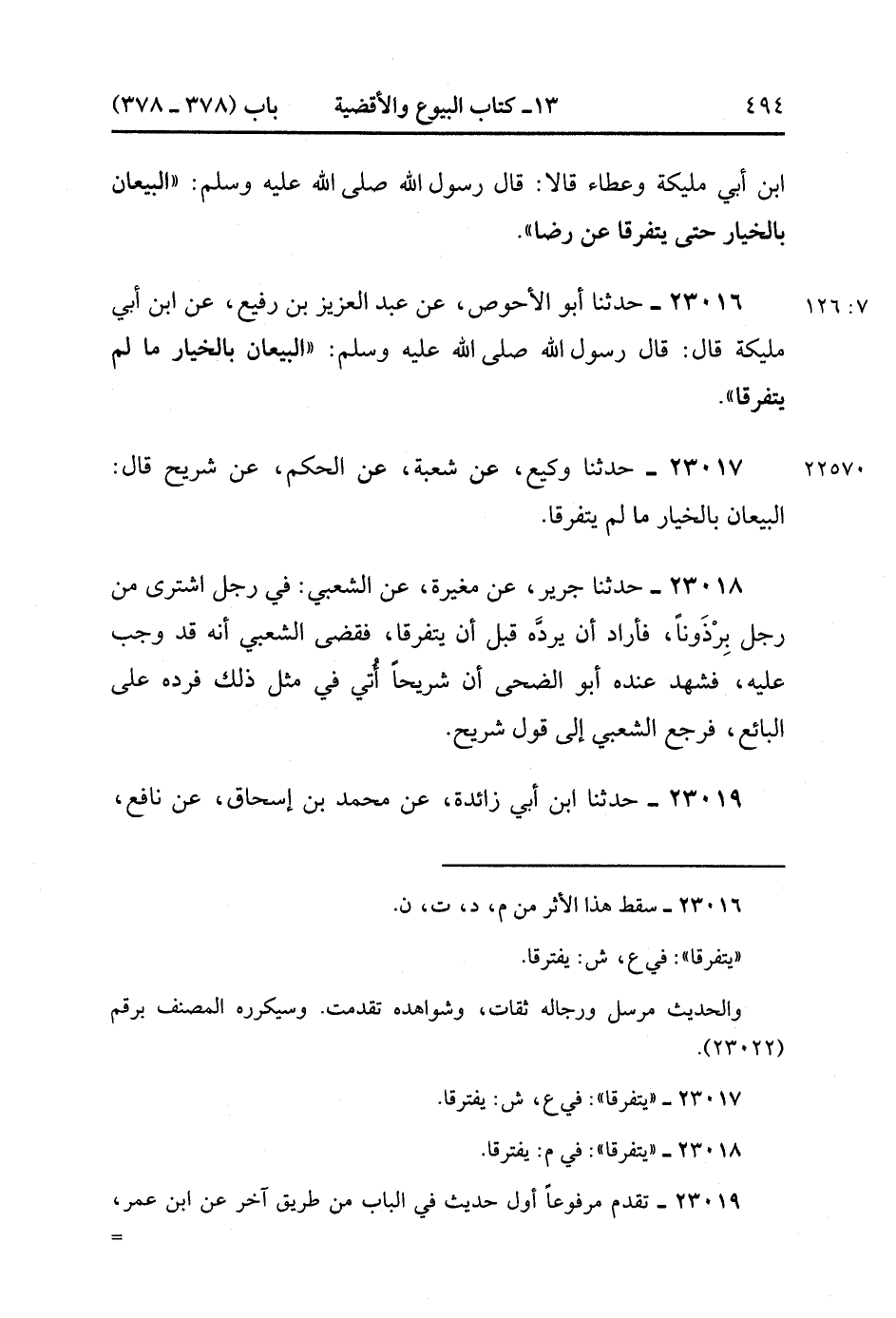 23016- حَدَّثَنَا أَبُو الأَحْوَصِ ، عَنْ عَبْدِ الْعَزِيزِ بْنِ رُفَيْعٍ ، عَنِ ابْنِ أَبِي مُلَيْكَةَ ، قَالَ : قَالَ رَسُولُ اللهِ صَلَّى الله عَلَيْهِ وَسَلَّمَ : الْبَيِّعَانِ بِالْخِيَارِ مَا لَمْ يَتَفَرَّقَا. (7/125).