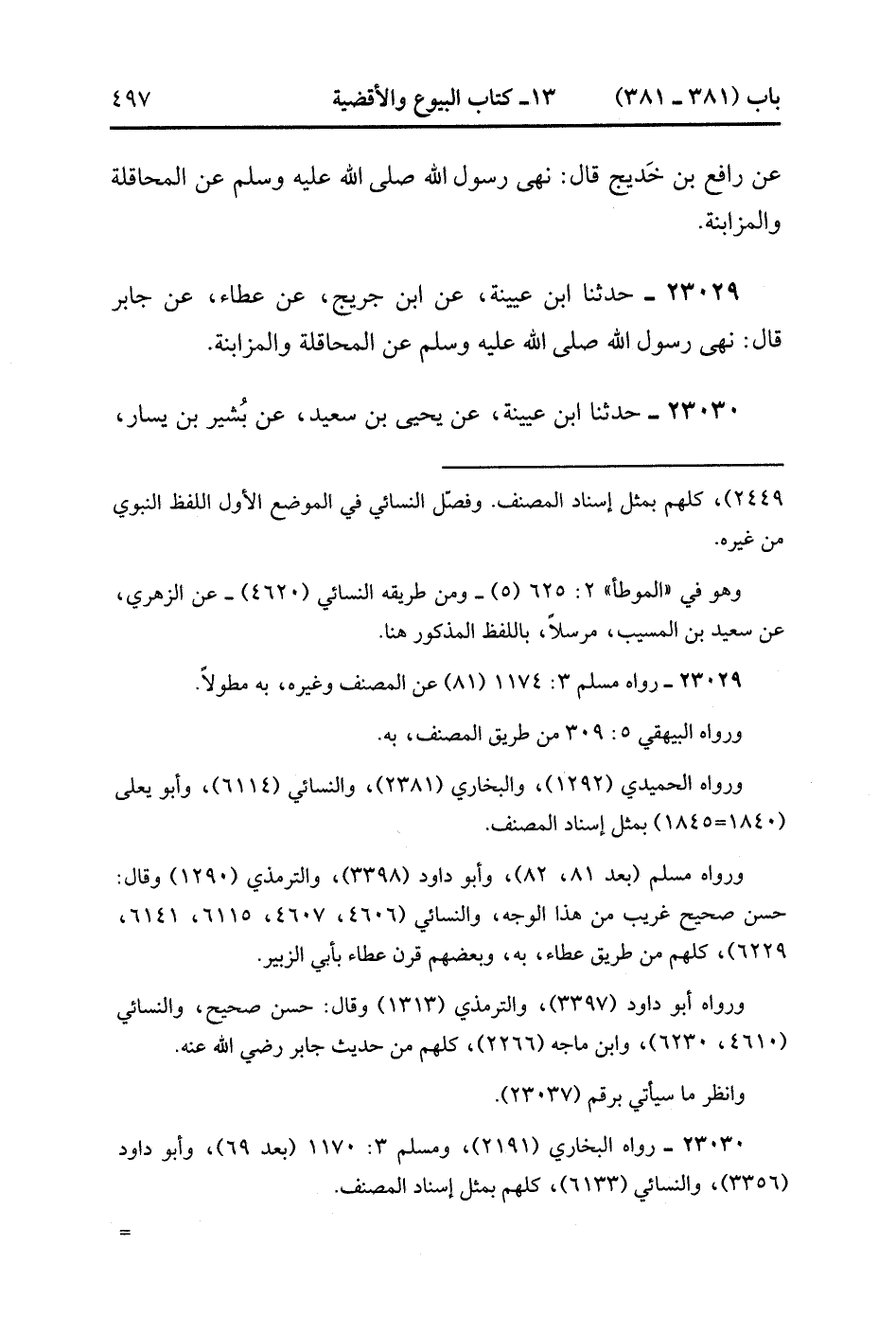 23028- حَدَّثَنَا أَبُو الأَحْوَصِ ، عَنْ طَارِقٍ ، عَنْ سَعِيدِ بْنِ الْمُسَيَّبِ ، عَنْ رَافِعِ بْنِ خَدِيجٍ ، قَالَ : نَهَى رَسُولُ اللهِ صَلَّى الله عَلَيْهِ وَسَلَّمَ عَنِ الْمُحَاقَلَةِ وَالْمُزَابَنَةِ. (7/128).