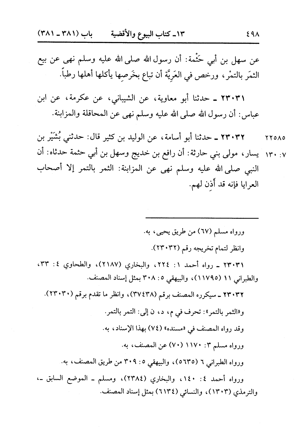 23032- حَدَّثَنَا أَبُو أُسَامَةَ ، عَنِ الْوَلِيدِ بْنِ كَثِيرٍ ، قَالَ : حدَّثَنِي بُشَيْرُ بْنُ يَسَارٍ مَوْلَى بَنِي حَارِثَةَ ، أَنَّ رَافِعَ بْنَ خَدِيجٍ وَسَهْلَ بْنَ أَبِي حَثْمَةَ حَدَّثَاهُ ؛ أَنَّ النَّبِيَّ صَلَّى الله عَلَيْهِ وَسَلَّمَ نَهَى عَنِ الْمُزَابَنَةِ الثَّمَرُ بِالتَّمْرِ إلاَّ أَصْحَابَ الْعَرَايَا فَإِنَّهُ قَدْ أَذِنَ لَهُمْ. (7/129).