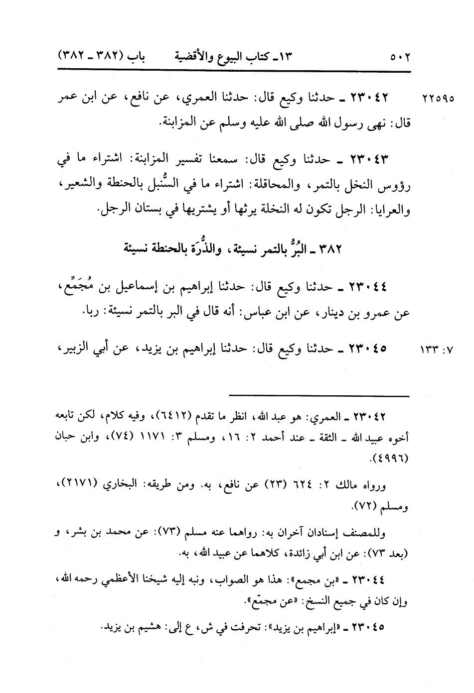 23042- حَدَّثَنَا وَكِيعٌ , قَالَ : حدَّثَنَا الْعُمَرِيِّ ، عَنْ نَافِعٍ ، عَنِ ابْنِ عُمَرَ ، قَالَ : نَهَى رَسُولُ اللهِ صَلَّى الله عَلَيْهِ وَسَلَّمَ عَنِ الْمُزَابَنَةِ.