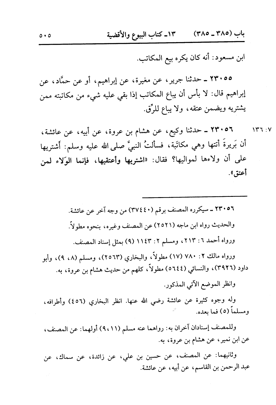23056- حَدَّثَنَا وَكِيعٌ ، عَنْ هِشَامِ بْنِ عُرْوَةَ ، عَنْ أَبِيهِ ، عَنْ عَائِشَةَ ؛ أَنَّ بَرِيرَةَ أَتَتْهَا وَهِيَ مُكَاتَبَةٌ ، فَسَأَلْتُ النَّبِيَّ صَلَّى الله عَلَيْهِ وَسَلَّمَ : أَشْتَرِيهَا عَلَى أَنَّ وَلاَءَهَا لِمَوَالِيهَا ؟ فَقَالَ : اشْتَرِيهَا وَأَعْتِقِيهَا ، فَإِنَّمَا الْوَلاَءُ لِمَنْ أَعْتَقَ. (7/136).