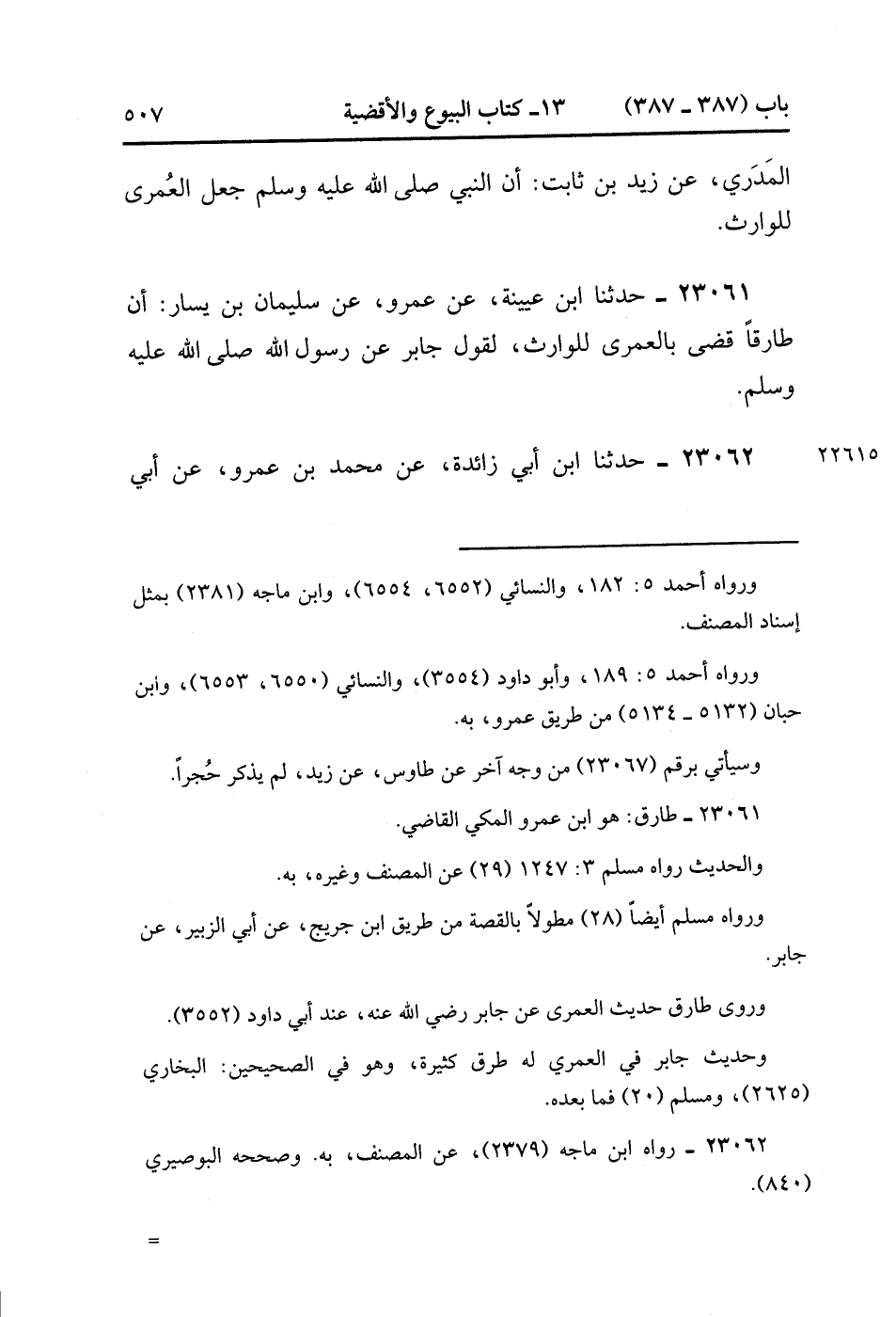 23061- حَدَّثَنَا ابْنُ عُيَيْنَةَ ، عَنْ عَمْرٍو ، عَنْ سُلَيْمَانَ بْنِ يَسَارٍ ؛ أَنَّ طَارِقًا قَضَى بِالْعُمْرَى لِلْوَارِثِ لِقَوْلِ جَابِرٍ عَنْ رَسُولِ اللهِ صَلَّى الله عَلَيْهِ وَسَلَّمَ. (7/137).