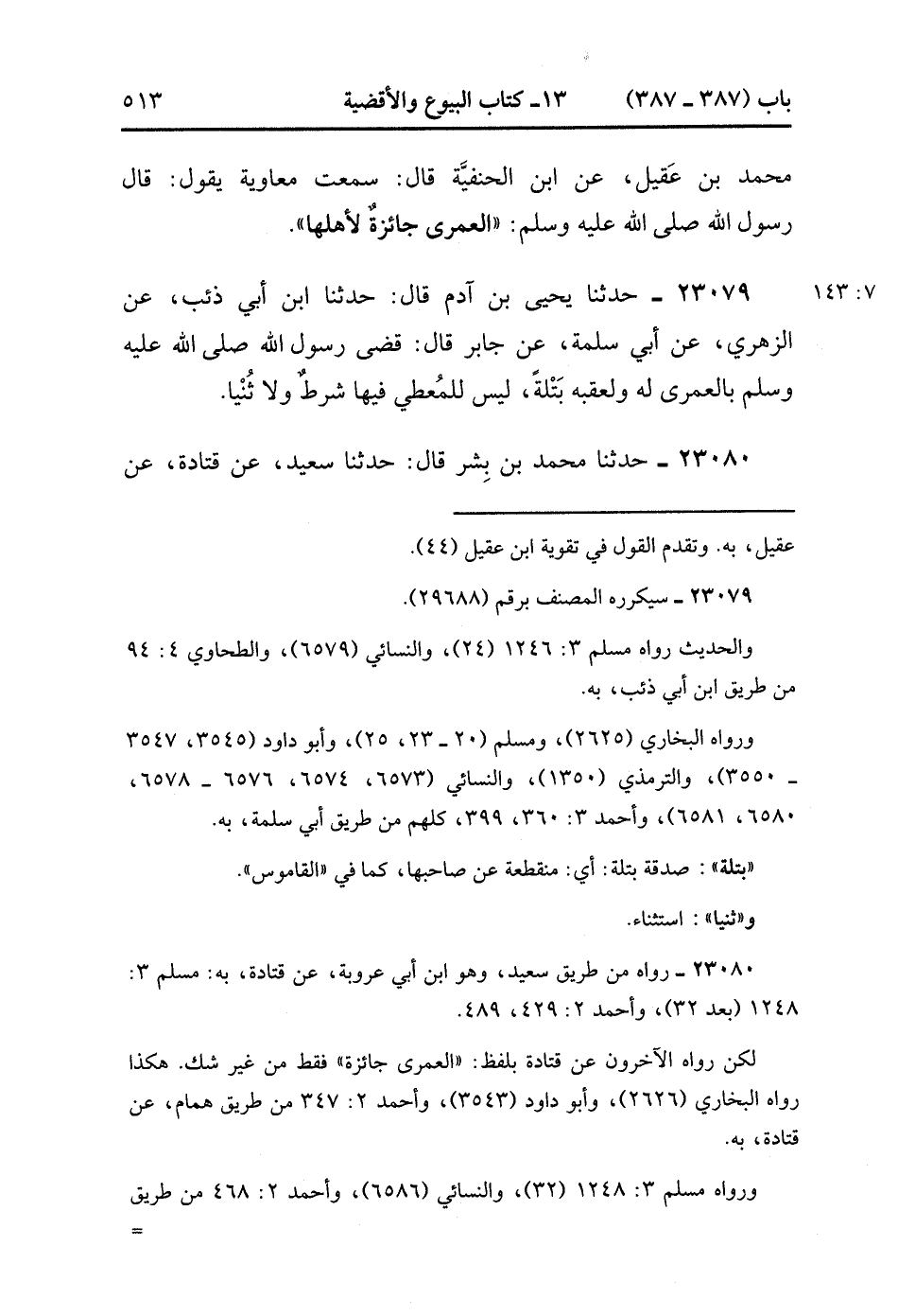23080- حَدَّثَنَا مُحَمَّدُ بْنُ بِشْرٍ , قَالَ : حدَّثَنَا سَعِيدٌ ، عَنْ قَتَادَةَ ، عَنِ النَّضْرِ بْنِ أَنَسٍ ، عَنْ بَشِيرِ بْنِ نَهِيكٍ ، عَنْ أَبِي هُرَيْرَةَ ، قَالَ : قَالَ رَسُولُ اللهِ صَلَّى الله عَلَيْهِ وَسَلَّمَ : الْعُمْرَى جَائِزَةٌ لأَِهْلِهَا ، أَوْ مِيرَاثٌ لأَِهْلِهَا. (7/143).