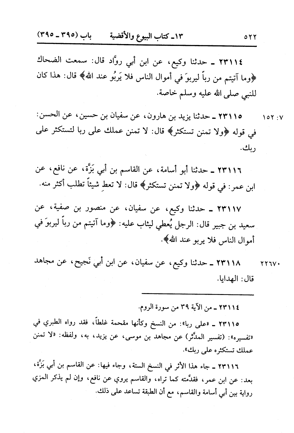 23117- حَدَّثَنَا وَكِيعٌ , قَالَ : حدَّثَنَا سُفْيَانُ ، عَنْ مَنْصُورِ بْنِ صَفِيَّةَ ، عَنْ سَعِيدِ بْنِ جُبَيْرٍ ، قَالَ : الرَّجُلُ يُعْطِي لِيُثَابَ عَلَيْهِ ، {وَمَا آتَيْتُمْ مِنْ رِبًا لِيَرْبُوا فِي أَمْوَالِ النَّاسِ فَلاَ يَرْبُوَا عِنْدَ اللهِ}.