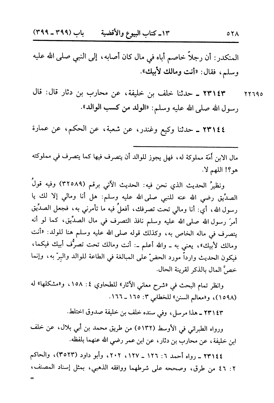23143- حَدَّثَنَا خلف بْنُ خَلِيفَةَ ، عَنْ مُحَارِبِ بْنِ دِثَارٍ ، قَالَ : قَالَ رَسُولُ اللهِ صَلَّى الله عَلَيْهِ وَسَلَّمَ : الْوَلَدُ مِنْ كَسْبِ الْوَالِدِ.