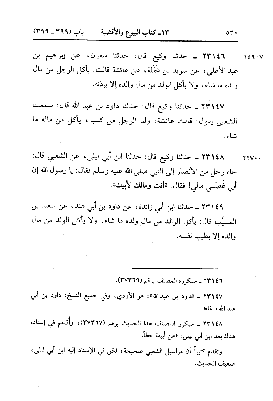 23149- حَدَّثَنَا ابْنُ أَبِي زَائِدَةَ ، عَنْ دَاوُدَ بْنِ أَبِي هِنْدٍ ، عَنْ سَعِيدِ بْنِ الْمُسَيَّبِ ، قَالَ : يَأْكُلُ الْوَالِدُ مِنْ مَالِ وَلَدِهِ مَا شَاءَ ، وَلاَ يَأْكُلُ الْوَلَدُ مِنْ مَالِ وَالِدِهِ إلاَّ بِطِيبِ نَفْسِهِ. (7/159).