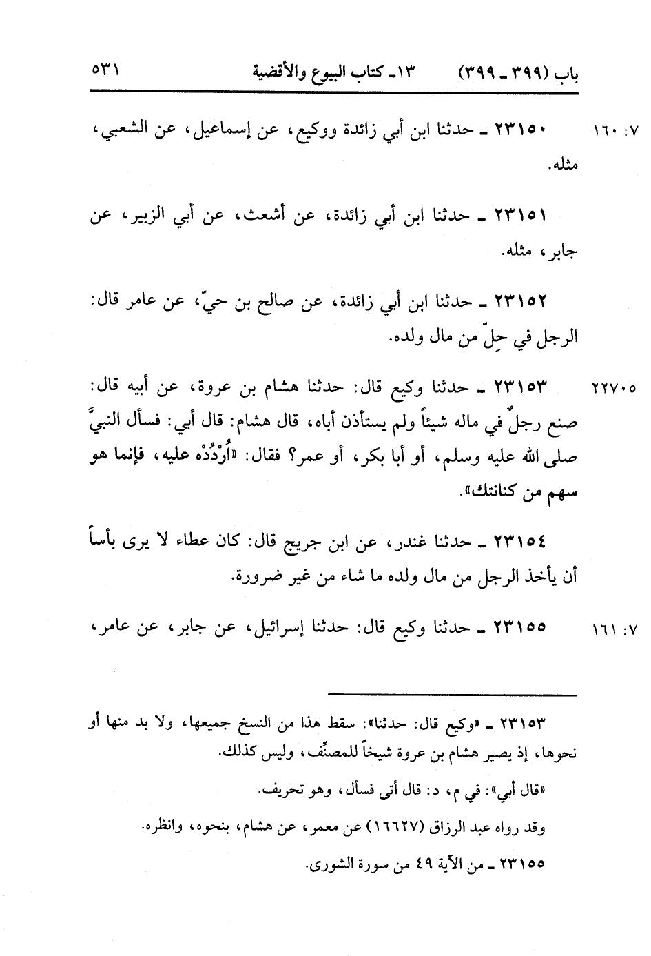 23153- حَدَّثَنَا وَكِيعٌ , قَالَ : حدَّثَنَا هِشَامُ بْنُ عُرْوَةَ ، عَنْ أَبِيهِ ، قَالَ : صَنَعَ رَجُلٌ فِي مَالِهِ شَيْئًا وَلَمْ يَسْتَأْذِنْ أَبَاهُ ، قَالَ هِشَامٌ : قَالَ أَبِي : فَسَأَلَ النَّبِيَّ صَلَّى الله عَلَيْهِ وَسَلَّمَ ، أَوْ أَبَا بَكْرٍ ، أَوْ عُمَرَ فَقَالَ : ارْدُدْه عَلَيْهِ فَإِنَّمَا هُوَ سَهْمٌ مِنْ كِنَانَتِكَ.