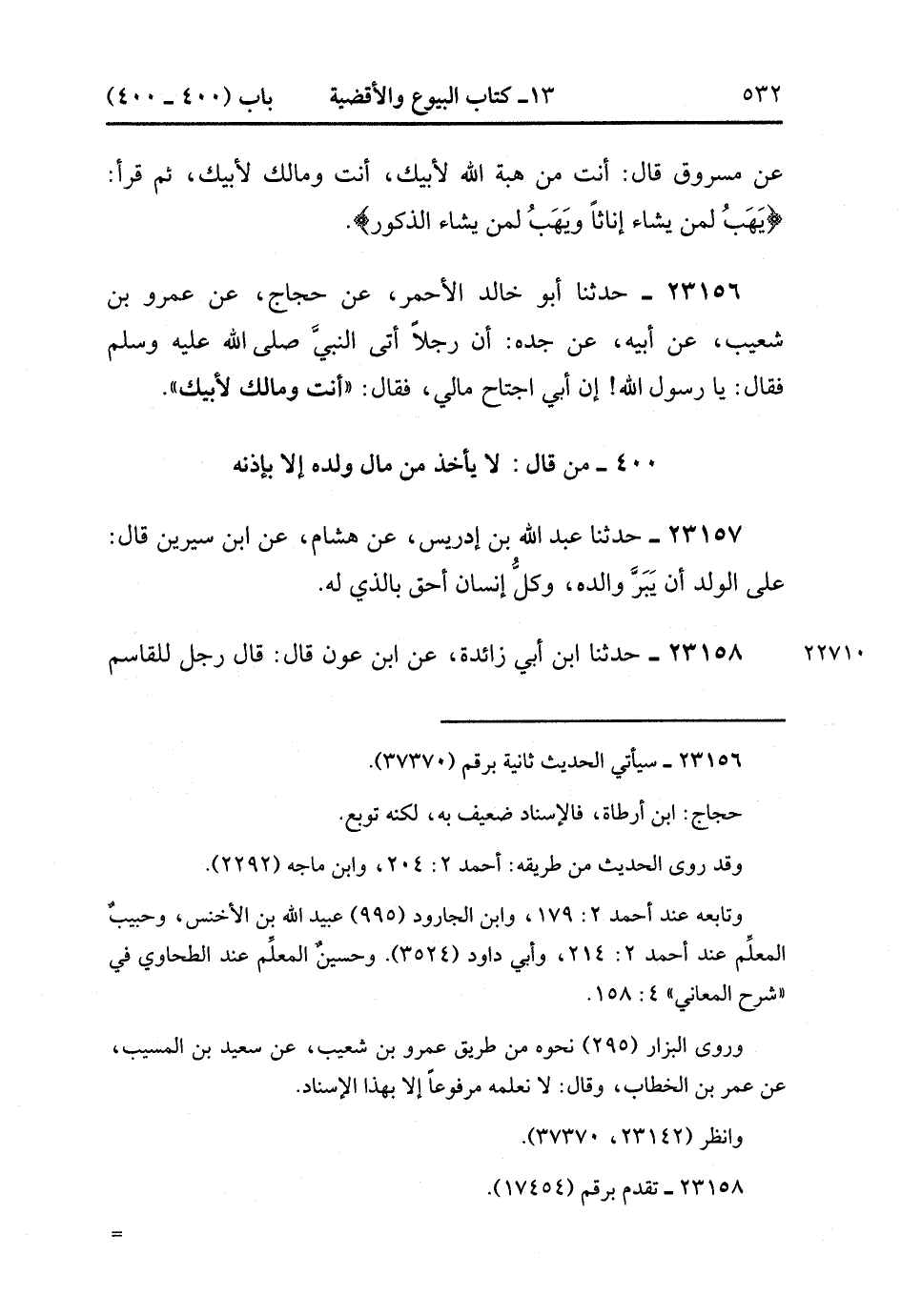 23156- حَدَّثَنَا أَبُو خَالِدٍ الأَحْمَرُ ، عَنْ حَجَّاجٍ ، عَنْ عَمْرِو بْنِ شُعَيْبٍ ، عَنْ أَبِيهِ ، عَنْ جَدِّهِ ؛ أَنَّ رَجُلاً أَتَى النَّبِيَّ صَلَّى الله عَلَيْهِ وَسَلَّمَ فَقَالَ : يَا رَسُولَ اللهِ إنَّ أَبِي اجْتَاحَ مَالِي ، فَقَالَ : أَنْتَ وَمَالُكَ لأَِبِيكَ.