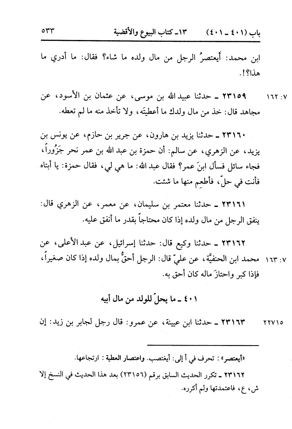 23163- حَدَّثَنَا ابْنُ عُيَيْنَةَ ، عَنْ عَمْرٍو ، قَالَ رَجُلٌ لِجَابِرِ بْنِ زَيْدٍ : إنَّ أَبِي يَحْرِمُنِي مَالَهُ ، يَقُولُ : لاَ أُعْطِيكَ مِنْهُ شَيْئًا ، قَالَ : كُلْ مِنْ مَالِ أَبِيك بِالْمَعْرُوفِ. (7/163).