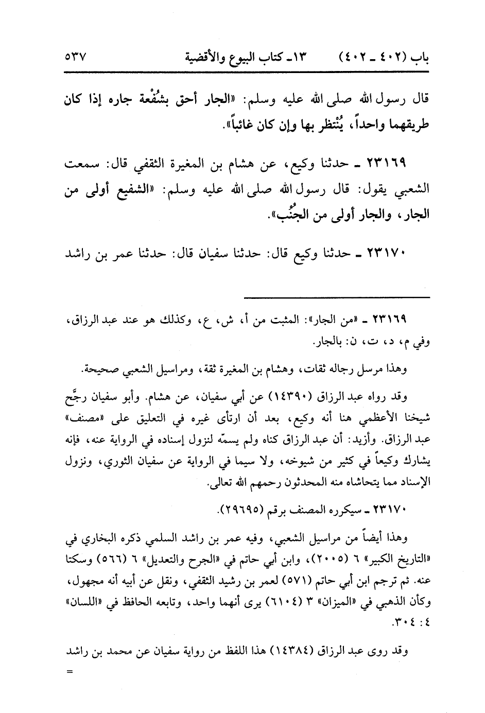 23169- حَدَّثَنَا وَكِيعٌ ، عَنْ هِشَامِ بْنِ الْمُغِيرَةِ الثَّقَفِيِّ ، قَالَ : سَمِعْتُ الشَّعْبِيَّ يَقُولُ : قَالَ رَسُولُ اللهِ صَلَّى الله عَلَيْهِ وَسَلَّمَ : الشَّفِيعُ أَوْلَى مِنَ الْجَارِ ، وَالْجَارُ أَوْلَى مِنَ الْجُنُبِ.