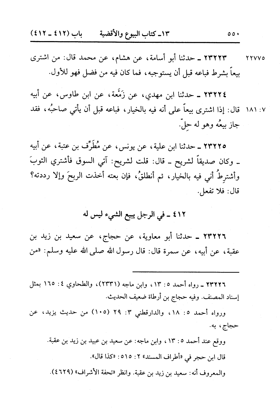 23226- حَدَّثَنَا أَبُو مُعَاوِيَةَ ، عَنْ حَجَّاجٍ ، عَنْ سَعِيدِ بْنِ زَيْدِ بْنِ عُقْبَةَ ، عَنْ أَبِيهِ ، عَنْ سَمُرَةَ ، قَالَ : قَالَ رَسُولُ اللهِ صَلَّى الله عَلَيْهِ وَسَلَّمَ : مَنْ ضَاعَ لَهُ مَتَاعٌ ، أَوْ سُرِقَ لَهُ مَتَاعٌ فَوَجَدَهُ فِي يَدِ رَجُلٍ فَهُوَ أَحَقُّ بِهِ ، وَيَرْجِعُ الْمُشْتَرِي عَلَى الْبَائِعِ. (7/181).