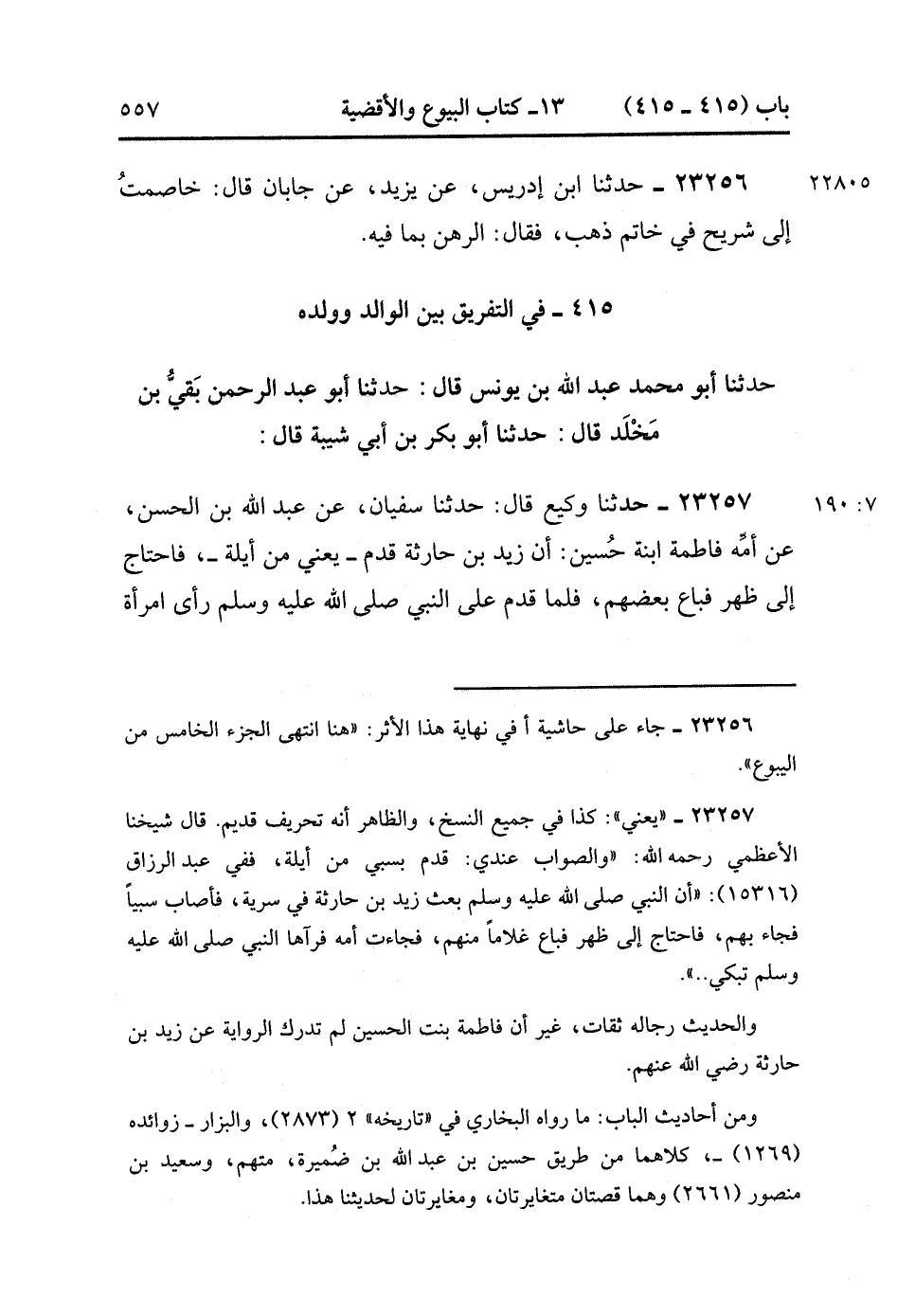 23257- حَدَّثَنَا وَكِيعٌ ، قَالَ : حَدَّثَنَا سُفْيَانُ ، عَنْ عَبْدِ اللهِ بْنِ الْحَسَنِ ، عَنْ أُمِّهِ فَاطِمَةَ ابْنَةِ حُسَيْنٍ ، أَنَّ زَيْدَ بْنَ حَارِثَةَ قَدِمَ ، يَعْنِي مِنْ أَيْلَةَ ، فَاحْتَاجَ إلَى ظَهْرٍ فَبَاعَ بَعْضَهُمْ ، فَلَمَّا قَدِمَ عَلَى النَّبِيِّ صَلَّى الله عَلَيْهِ وَسَلَّمَ رَأَى امْرَأَةً مِنْهُمْ تَبْكِي ، قَالَ : مَا شَأْنُ هَذِهِ ؟ فَأُخْبِرَ أَنَّ زَيْدًا بَاعَ وَلَدَهَا ، فَقَالَ لَهُ النَّبِيُّ صَلَّى الله عَلَيْهِ وَسَلَّمَ : ارْدُدْهُ أَوِ اشْتَرِهِ. (7/189).