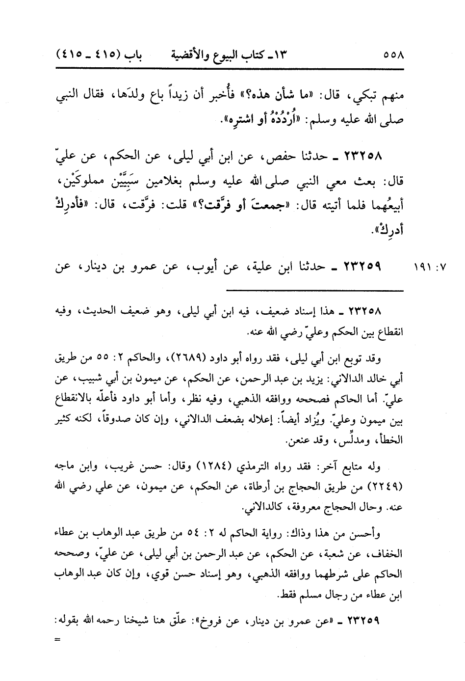 23258- حَدَّثَنَا حَفْصٌ ، عَنِ ابْنِ أَبِي لَيْلَى ، عَنِ الْحَكَمِ ، عَنْ عَلِيٍّ ، قَالَ : بَعَثَ مَعِي النَّبِيُّ صَلَّى الله عَلَيْهِ وَسَلَّمَ بِغُلاَمَيْنِ سَبِيَّيْنِ مَمْلُوكَيْنِ أَبِيعُهُمَا ، فَلَمَّا أَتَيْتُهُ ، قَالَ : جَمَعْتَ أَوْ فَرَّقْتَ ؟ قُلْتُ : فَرَّقْتُ ، قَالَ : فَأَدْرِكْ أَدْرِكْ.