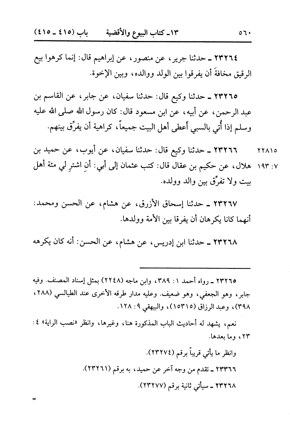 23264- حَدَّثَنَا جَرِيرٌ ، عَنْ مَنْصُورٍ ، عَنْ إبْرَاهِيمَ ، قَالَ : إنَّمَا كَرِهُوا بَيْعَ الرَّقِيقِ مَخَافَةَ أَنْ يُفَرِّقُوا بَيْنَ الْوَلَدِ وَوَالِدِهِ وَبَيْنَ الإِخْوَةِ.