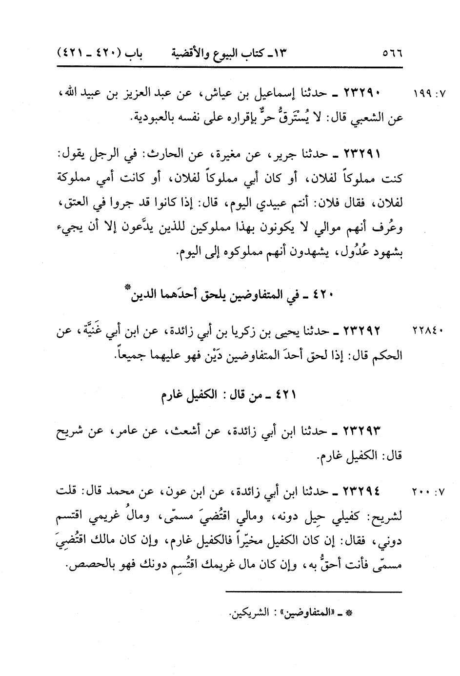 23293- حَدَّثَنَا ابْنُ أَبِي زَائِدَةَ ، عَنْ أَشْعَثَ ، عَنْ عَامِرٍ ، عَنْ شُرَيْحٍ ، قَالَ : الْكَفِيلُ غَارِمٌ. (7/199).