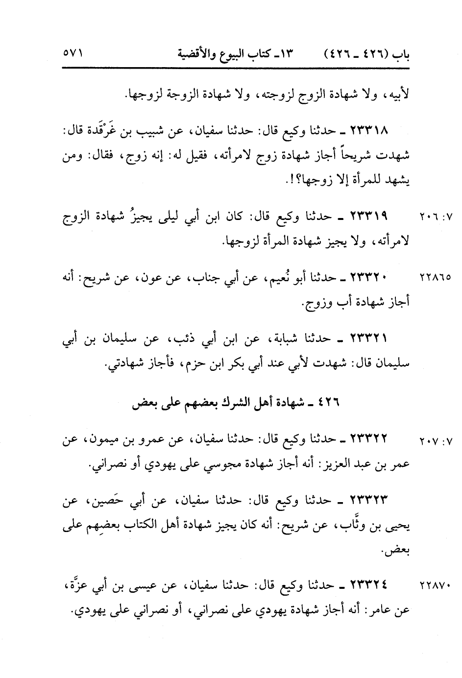 23324- حَدَّثَنَا وَكِيع ، قَالَ : حَدَّثَنَا سُفْيَانُ ، عَنْ عِيسَى بْنِ أَبِي عَزَّةَ ، عَنْ عَامِرٍ : أَنَّهُ أَجَازَ شَهَادَةَ يَهُودِيٍّ عَلَى نَصْرَانِيٍّ ، أَوْ نَصْرَانِيٍّ عَلَى يَهُودِيٍّ. (7/207).