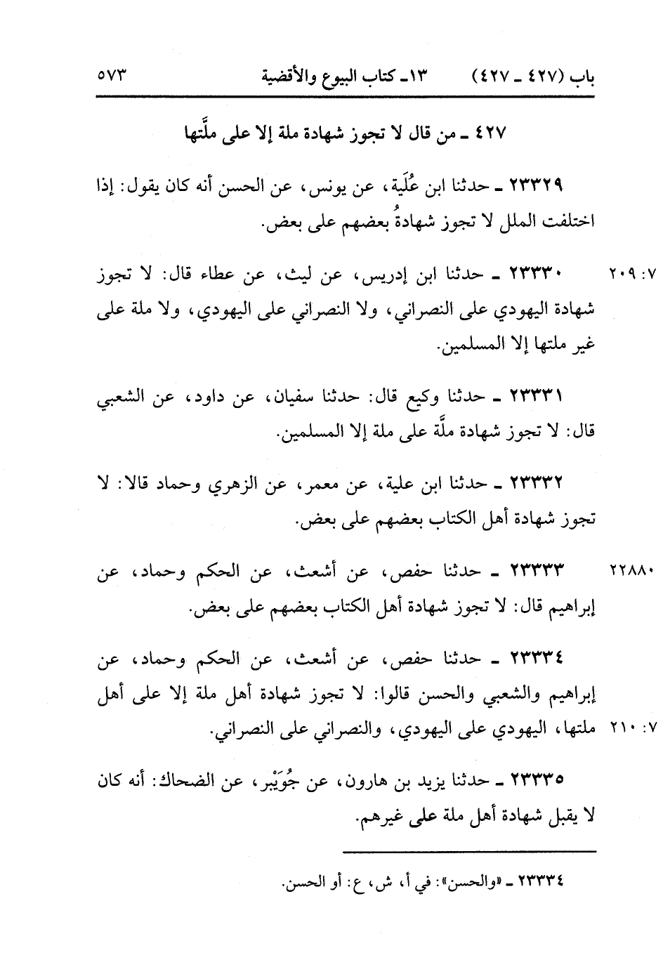 23334- حَدَّثَنَا حَفْصٌ ، عَنْ أَشْعَثَ ، عَنِ الْحَكَمِ وَحَمَّادٍ ، عَنْ إبْرَاهِيمَ والشَّعْبِيِّ والْحَسَنِ ، قَالُوا : لاَ تَجُوزُ شَهَادَةُ أَهْلِ مِلَّةٍ إلاَّ عَلَى أَهْلِ مِلَّتِهَا : الْيَهُودِيُّ عَلَى الْيَهُودِيِّ ، وَالنَّصْرَانِيُّ عَلَى النَّصْرَانِيِّ. (7/209).