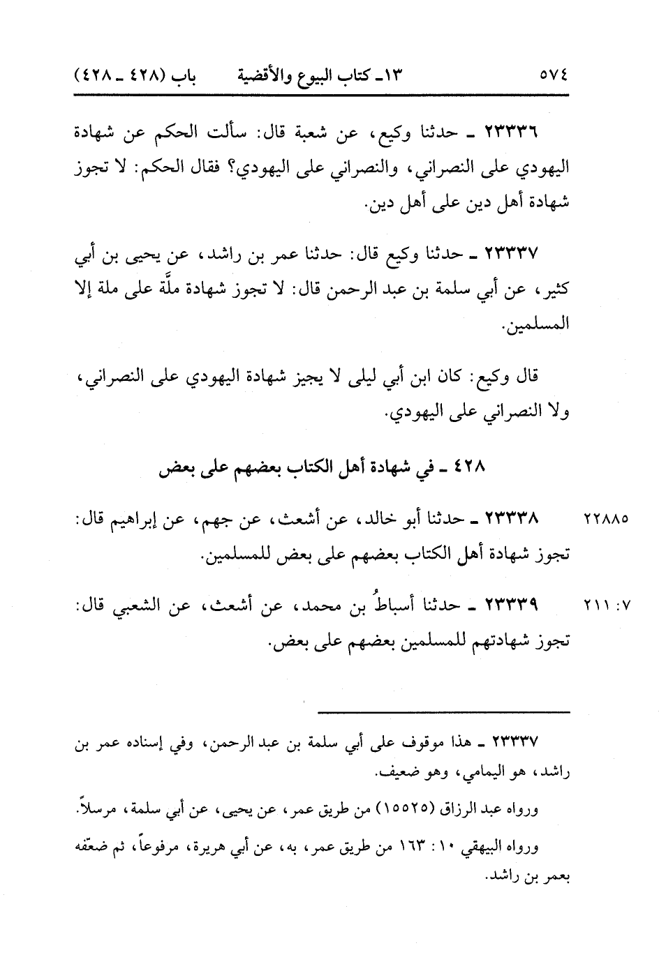 23336- حَدَّثَنَا وَكِيعٌ ، عَنْ شُعْبَةَ ، قَالَ : سَأَلْتُ الْحَكَمَ عْن شَهَادَةِ الْيَهُودِيِّ عَلَى النَّصْرَانِيِّ ، وَالنَّصْرَانِيِّ عَلَى الْيَهُودِيِّ ؟ فَقَالَ : الْحَكَمُ : لاَ تَجُوزُ شَهَادَةُ أَهْلِ دِينٍ عَلَى أهل دِينٍ.