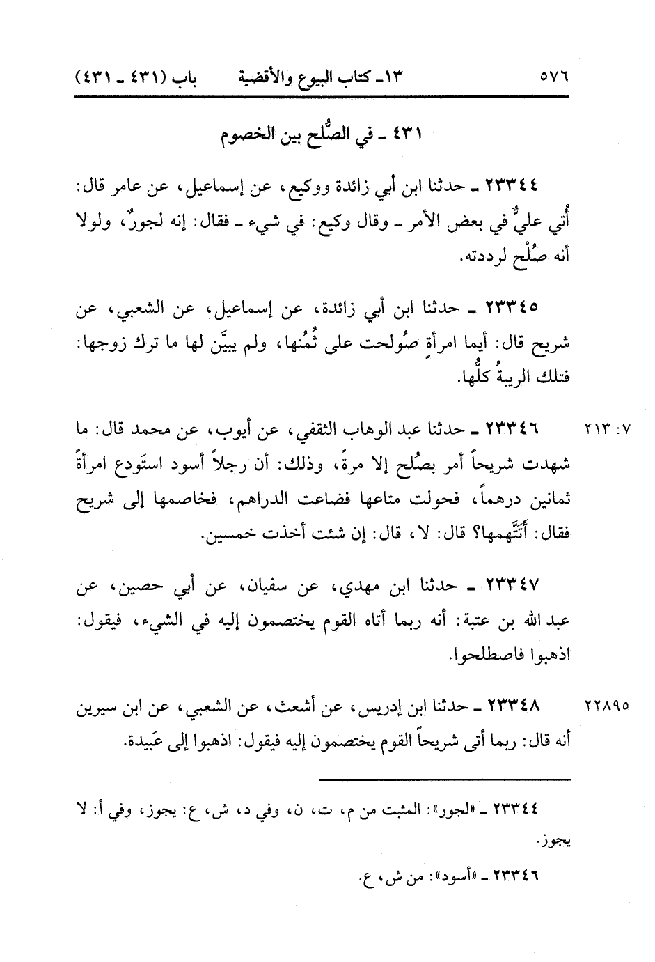 23344- حَدَّثَنَا ابْنُ أَبِي زَائِدَةَ وَوَكِيعٌ ، عَنْ إسْمَاعِيلَ ، عَنْ عَامِرٍ ، قَالَ : أُتِيَ عَلِيَّ فِي بَعْضِ الأَمْرِ ، وَقَالَ وَكِيعٌ : فِي شَيْءٍ ، فَقَالَ : إِنَّهُ لَجَوْرٌ ، وَلَوْلا أَنَّهُ صُلْحٌ لَرَدَدْتُهُ.