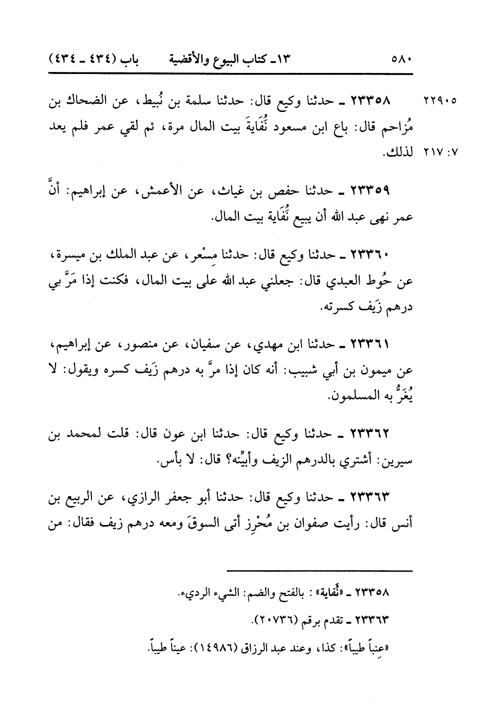 23358- حَدَّثَنَا وكيع ، قَالَ : حَدَّثَنَا سَلَمَةُ بْنُ نُبَيْطٍ ، عَنِ الضَّحَّاكِ بْنِ مُزَاحِمٍ ، قَالَ : بَاعَ ابْنُ مَسْعُودٍ نُفَايَةَ بَيْتِ الْمَالِ مَرَّةً ، ثُمَّ لَقِيَ عُمَرَ فَلَمْ يَعُدْ لِذَلِكَ. (7/216).
