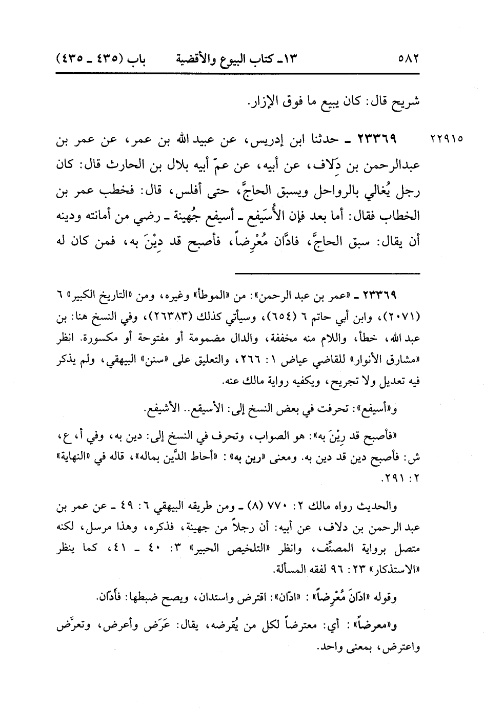 23369- حَدَّثَنَا ابْنُ إدْرِيسَ ، عَنْ عُبَيْدِ اللهِ بْنِ عُمَرَ ، عَنْ عُمَرَ بْنِ عَبْدِ الرَّحْمَنِ بْنِ دِلاَفٍ ، عَنْ أَبِيهِ ، عَنْ عَمِّ أَبِيهِ بِلاَلِ بْنِ الْحَارِثِ ، قَالَ : كَانَ رَجُلٌ يُغَالِي بِالرَّوَاحِلِ ، وَيَسْبِقُ الْحَاجَّ ، حَتَّى أَفْلَسَ ، قَالَ : فَخَطَبَ عُمَرُ بْنُ الْخَطَّابِ فَقَالَ : أَمَّا بَعْدُ فَإِنَّ الأُسَيْفِعَ أُسَيْفِعَ جُهَيْنَةَ رَضِيَ مِنْ أَمَانَتِهِ وَدِينِهِ أَنْ ، يُقَالَ : سَبَقَ الْحَاجَّ ، فَادَّانَ مُعْرِضًا ، فَأَصْبَحَ قَدْ دِيْنَ بِهِ ، فَمَنْ كَانَ لَهُ عَلْيهِ شَيْءٌ فَلِيَأْتِنَا حَتَّى نُقَسِّمَ مَالَهُ بَيْنَهُمْ. (7/219).