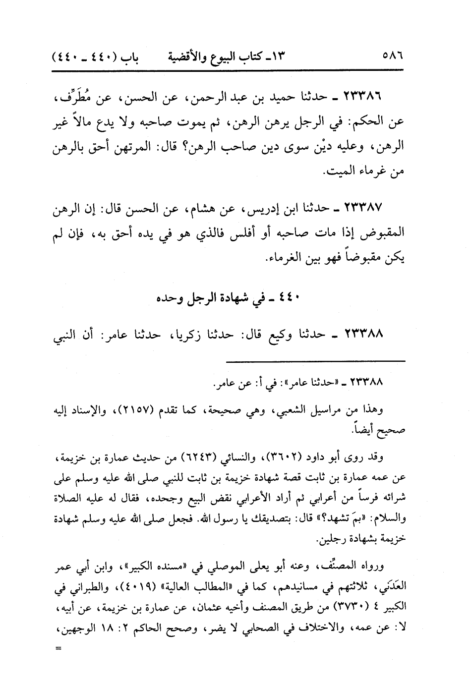 23388- حَدَّثَنَا وَكِيعٌ , قَالَ : حدَّثَنَا زَكَرِيَّا ، حَدَّثَنَا عَامِرٌ ؛ أَنَّ النَّبِيَّ صَلَّى الله عَلَيْهِ وَسَلَّمَ أَجَازَ شَهَادَةَ خُزَيْمَةَ بْنِ ثَابِتٍ بِشَهَادَةَ رَجُلَيْنِ. (7/223).