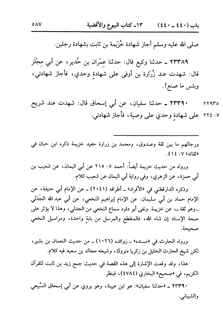 23390- حَدَّثَنَا سُفْيَانُ ، عَنْ أَبِي إِسْحَاقَ ، قَالَ : شَهِدْتُ عِنْدَ شُرَيْحٍ عَلَى شَهَادَةٍ وَحْدِي عَلَى وَصِيَّةٍ فَأَجَازَ شَهَادَتِي. (7/224).