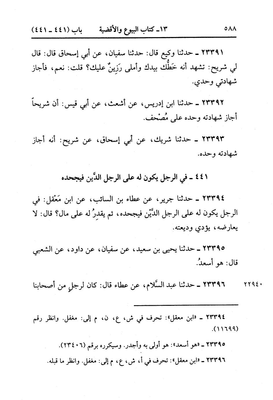 23391- حَدَّثَنَا وكيع ، قَالَ : حَدَّثَنَا سُفْيَانَ ، عَنْ أَبِي إِسْحَاقَ ، قَالَ : قَالَ لِي شُرَيْحٌ : تَشْهَدُ أَنَّهُ خَطُّكَ بِيَدِكَ ، وَأملى رَزِينٌ عَلَيْكَ؟ قُلْتُ : نَعَمْ ، فَأَجَازَ شَهَادَتِي وَحْدِي.