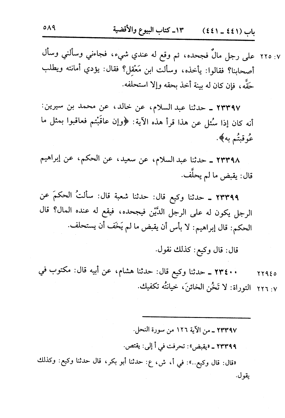 23397- حَدَّثَنَا عَبْدُ السَّلاَمِ ، عَنْ خَالِدٍ ، عَنْ مُحَمَّدِ بْنِ سِيرِينَ : أَنَّهُ كَانَ إذَا سُئِلَ عَنْ هَذَا قَرَأَ هَذِهِ الآيَةَ : {وَإِنْ عَاقَبْتُمْ فَعَاقِبُوا بِمِثْلِ مَا عُوقِبْتُمْ بِهِ}.
