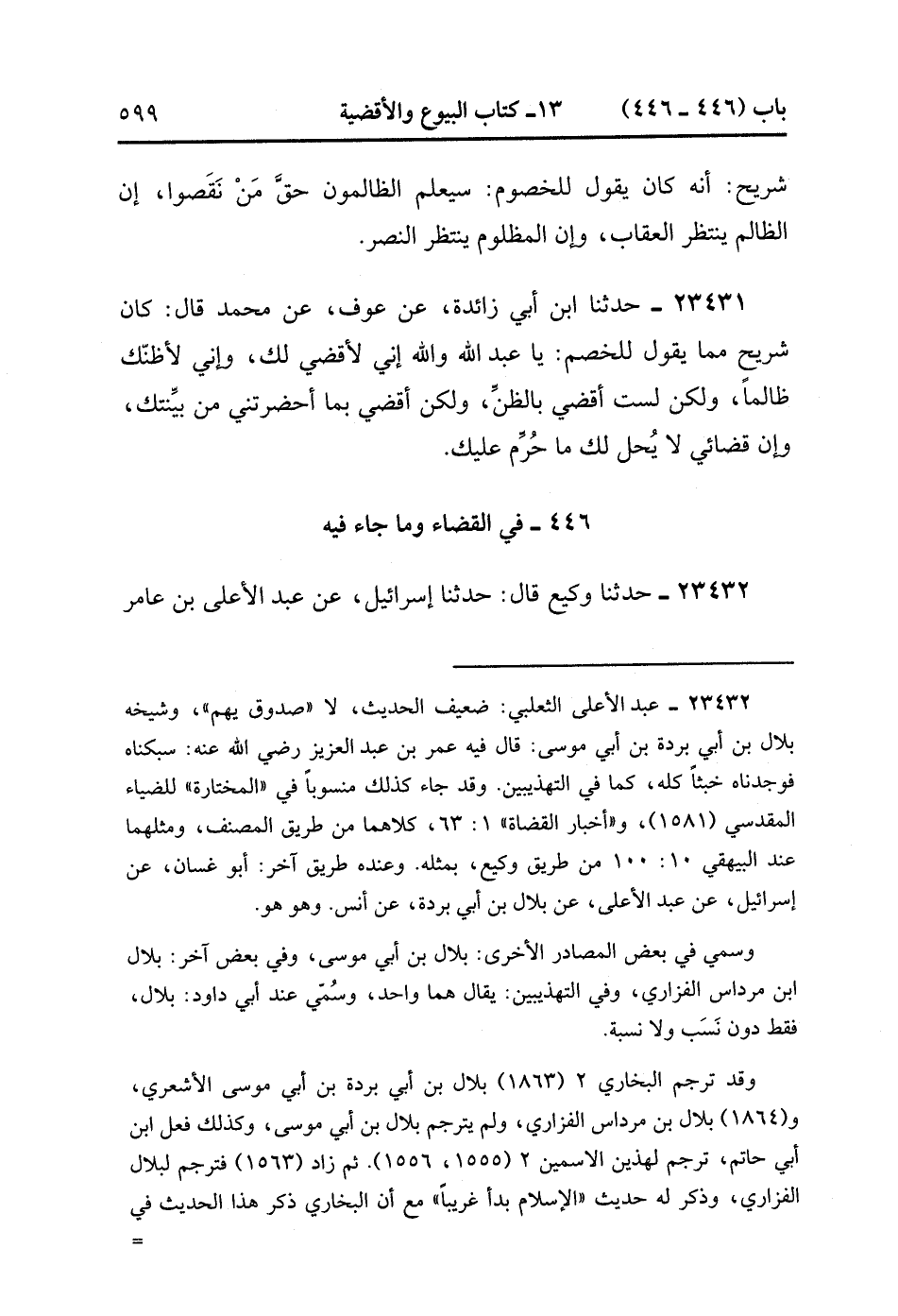 23431- حَدَّثَنَا ابْنُ أَبِي زَائِدَةَ ، عَنْ عَوْفٍ ، عَنْ مُحَمَّدٍ ، قَالَ : كَانَ شُرَيْحٌ مِمَّا يَقُولُ لِلْخَصمِ : يَا عَبْدَ اللهِ ، وَاللَّهِ إنِّي لاَقْضِي لَكَ ، وَإِنِّي لاَظُنُّك ظَالِمًا ، وَلَكِنْ لَسْتُ أَقْضِي بِالظَّنِّ ، وَلَكِنْ أَقْضِي بِمَا أَحْضَرْتَنِي ، وَإِنَّ قَضَائِي لاَ يُحِلُّ لَكَ مَا حُرِّمَ عَلَيْكَ. (7/235).