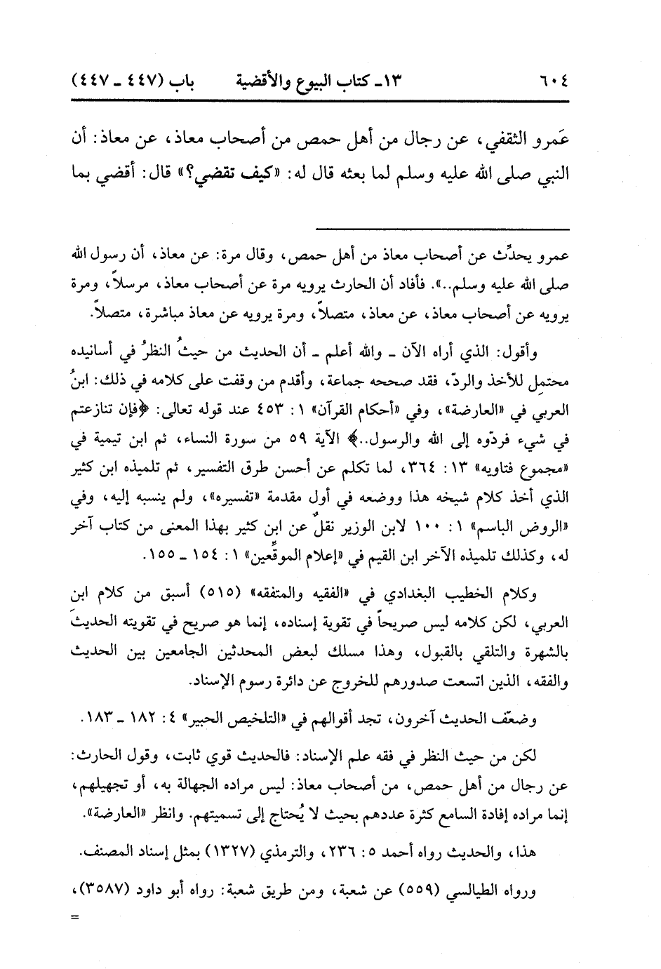 23442- حَدَّثَنَا وَكِيعٌ ، عَنْ شُعْبَةَ ، عَنْ أَبِي عَوْنٍ ، عَنِ الْحَارِثِ بْنِ عَمْرٍو الثَّقَفِيِّ ، عَنْ رِجَالٍ مِنْ أَهْلِ حِمْصٍ مِنْ أَصْحَابِ مُعَاذٍ ، عَنْ مُعَاذٍ ؛ أَنَّ النَّبِيَّ صَلَّى الله عَلَيْهِ وَسَلَّمَ لَمَّا بَعَثَهُ قَالَ لَهُ : كَيْفَ تَقْضِي ؟ قَالَ : أَقْضِي بِمَا فِي كِتَابِ اللهِ ، قَالَ : فَإِنْ جَاءَك أَمْرٌ لَيْسَ فِي كِتَابِ اللهِ ، قَالَ : أَقْضِي بِسُنَّةِ رَسُولِ اللهِ ، قَالَ : فَإِنْ لَمْ تَكُنْ سُنَّةٌ مِنْ رَسُولِ اللهِ ؟ قَالَ : أَجْتَهِدُ رَأْيِي ، قَالَ : الْحَمْدُ لِلَّهِ الَّذِي وَفَّقَ رَسُولَ رَسُولِ اللهِ صَلَّى الله عَلَيْهِ وَسَلَّمَ. (7/239).