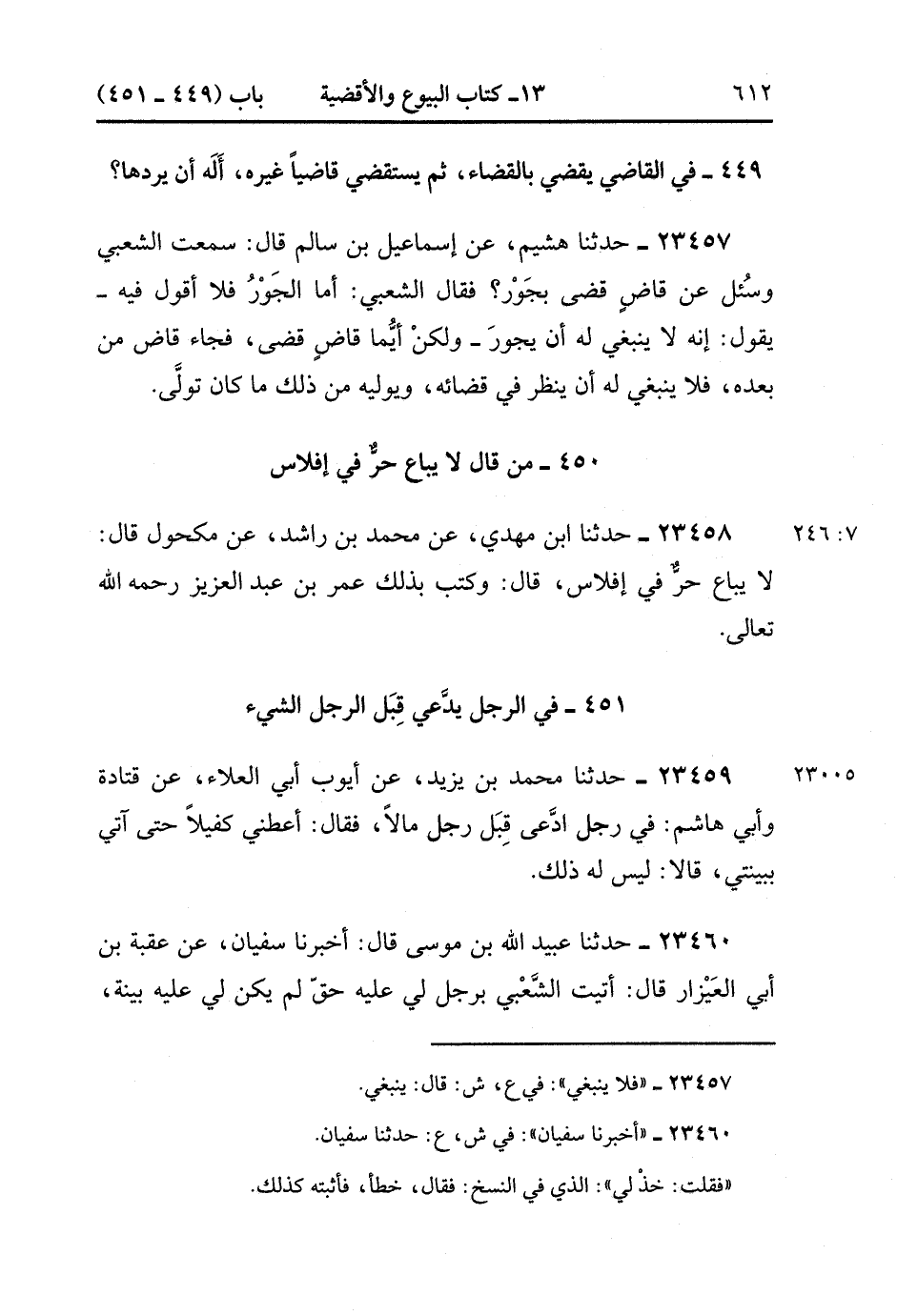 23460- حَدَّثَنَا عُبَيْدُ اللهِ بْنُ مُوسَى , قَالَ : أَخْبَرَنَا سُفْيَانُ ، عَنْ عُقْبَةَ بْنِ أَبِي الْعَيْزَارِ ، قَالَ : أَتَيْتُ الشَّعْبِيَّ بِرَجُلٍ لِي عَلَيْهِ حَقٌّ لَمْ يَكُنْ لِي عَلَيْهِ بَيِّنَةٌ ، فَقُلْت : خُذْ لِي مِنْهُ كَفِيلاً ، فَأَبَى أَنْ يَأْخُذَ لِي مِنْهُ كَفِيلاً. (7/246).