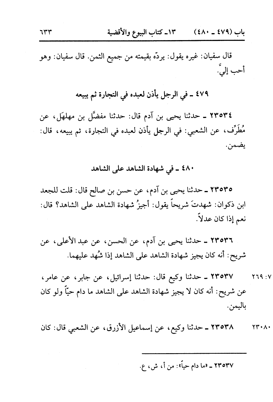 23535- حَدَّثَنَا يَحْيَى بْنُ آدَمَ ، عَنْ حَسَنِ بْنِ صَالِحٍ ، قَالَ : قُلْتُ لِلْجَعْدِ بْنِ ذَكْوَانَ : شَهِدْتَ شُرَيْحًا يَقُولُ : أُجِيزُ شَهَادَةَ الشَّاهِدِ عَلَى الشَّاهِدِ؟ قَالَ : نَعَمْ إذا كَانَ عدلاً.