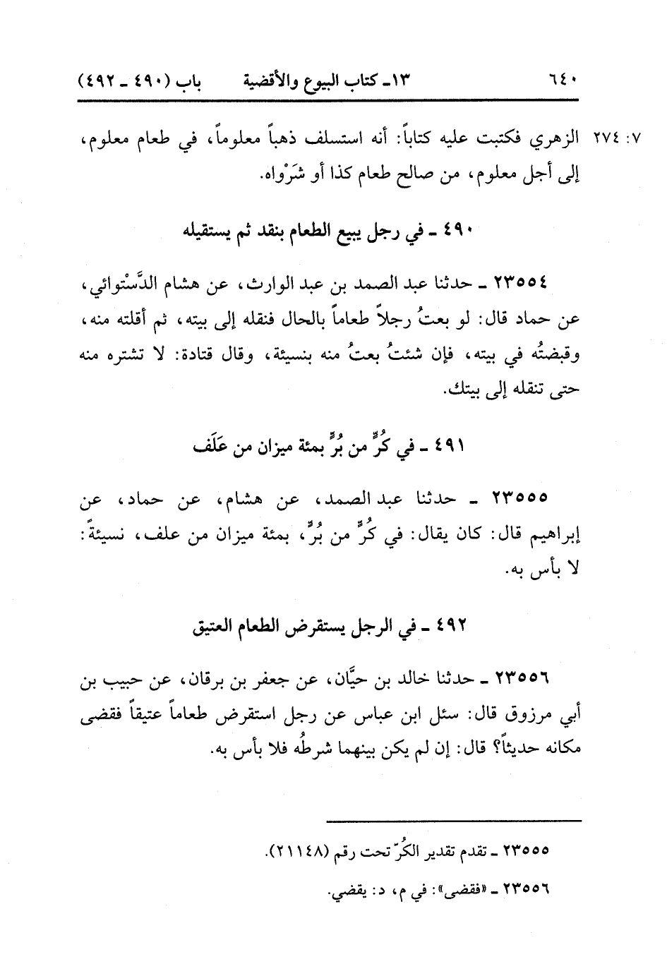 23555- حَدَّثَنَا عَبْدُ الصَّمَدِ ، عَنْ هِشَامٍ ، عَنْ حَمَّادٍ ، عَنْ إبْرَاهِيمَ ، قَالَ : كَانَ يُقَالَ فِي كُرٍّ مِنْ بُرٍّ بِمِئَةِ مِيزَانٍ مِنْ عَلَفٍ نَسِيئَةً : لاَ بَأْسَ بِهِ.