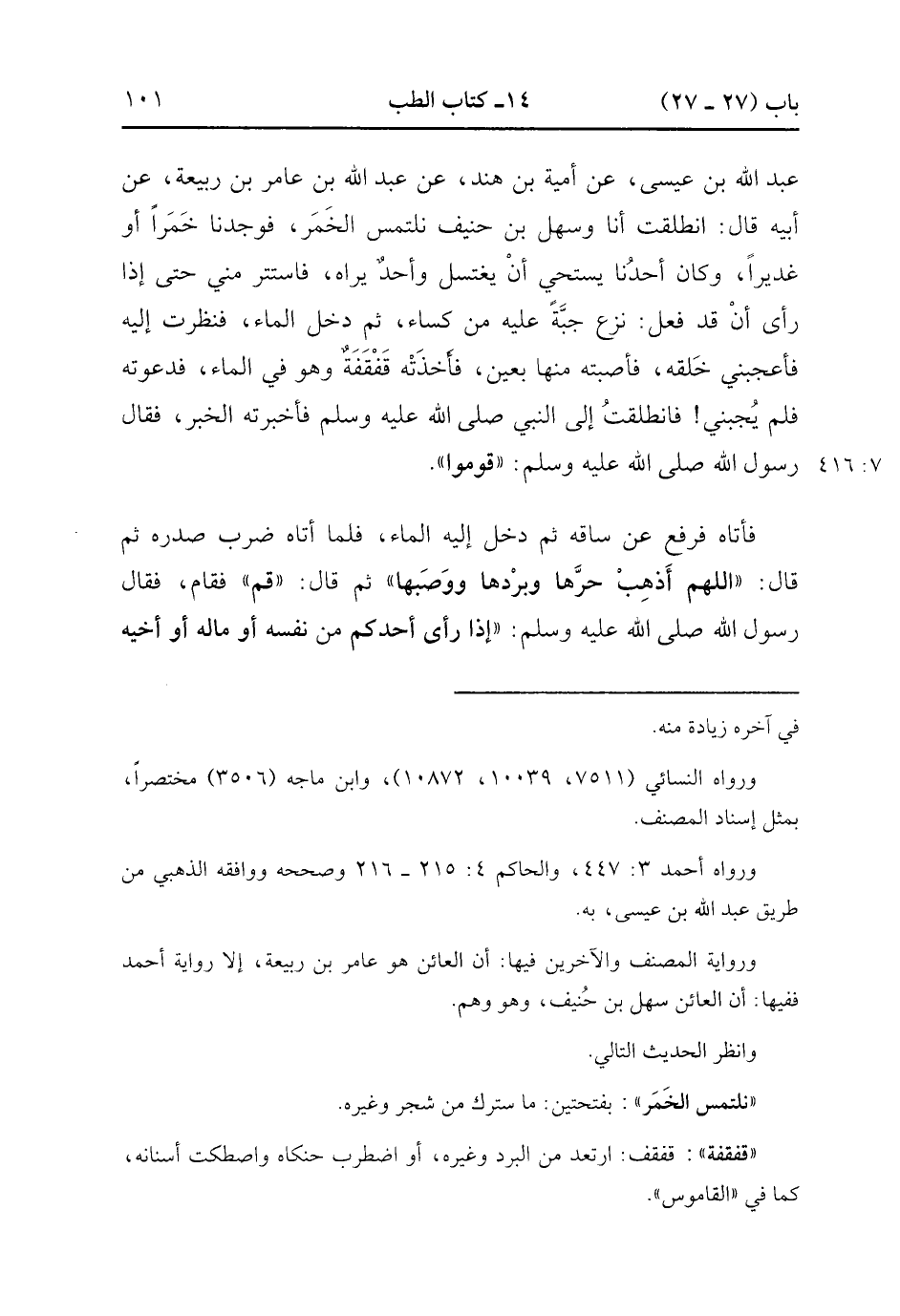 24060- حَدَّثَنَا مُعَاوِيَةُ بْنُ هِشَامٍ , قَالَ : حدَّثَنَا عَمَّارُ بْنُ رُزَيْقٍ ، عَنْ عَبْدِ اللهِ بْنِ عِيسَى ، عَنْ أُمَيَّةَ بْنِ هِنْدٍ ، عَنْ عَبْدِ اللهِ بْنِ عَامِرِ بْنِ رَبِيعَةَ ، عَنْ أَبِيهِ ، قَالَ : انْطَلَقْتُ أَنَا وَسَهْلُ بْنُ حُنَيْفٍ نَلْتَمِسُ الْخَمَرَ (1) ، فَوَجَدْنَا خَمِرًا ، أَوْ غَدِيرًا ، وَكَانَ أَحَدُنَا يَسْتَحْيِي أَنْ يَغْتَسِلَ وَأَحَدٌ يَرَاهُ ، فَاسْتَتَرَ مِنِّي حَتَّى إِذَا رَأَى أَنْ قَدْ فَعَلَ ، نَزَعَ جُبَّةً عَلَيْهِ مِنْ كِسَاءٍ ، ثُمَّ دَخَلَ الْمَاءَ ، فَنَظَرْتُ إِلَيْهِ فَأَعْجَبَنِي خَلْقُهُ ، فَأَصَبْتُهُ مِنْهَا بِعَيْنٍ ، فَأَخَذَتْهُ قَفْقَفَةٌ وَهُوَ فِي الْمَاءِ ، فَدَعَوْتُهُ فَلَمْ يُجِبْنِي ، فَانْطَلَقْتُ إِلَى النَّبِيِّ صَلَّى الله عَلَيْهِ وَسَلَّمَ فَأَخْبَرْتُهُ الْخَبَرَ ، فَقَالَ رَسُولُ اللهِ صَلَّى الله عَلَيْهِ وَسَلَّمَ : قُومُوا ، فَأَتَاهُ ، فَرَفَعَ عَنْ سَاقِهِ ، ثُمَّ دَخَلَ إِلَيْهِ الْمَاءَ ، فَلَمَّا أَتَاهُ ضَرَبَ صَدْرَهُ ، ثُمَّ قَالَ : اللَّهُمَّ أَذْهِبْ حَرَّهَا وَبَرْدَهَا وَوَصَبَهَا ، ثُمَّ قَالَ : قُمْ ، فَقَامَ : فَقَالَ رَسُولُ اللهِ صَلَّى الله عَلَيْهِ وَسَلَّمَ : إِذَا رَأَى أَحَدُكُمْ مِنْ نَفْسِهِ ، أَوْ مَالِهِ ، أَوْ أَخِيهِ ، مَا يُعْجِبُهُ ، فَلْيَدْعُ بِالْبَرَكَةِ ، فَإِنَّ الْعَيْنَ حَقٌّ. (7/415).
