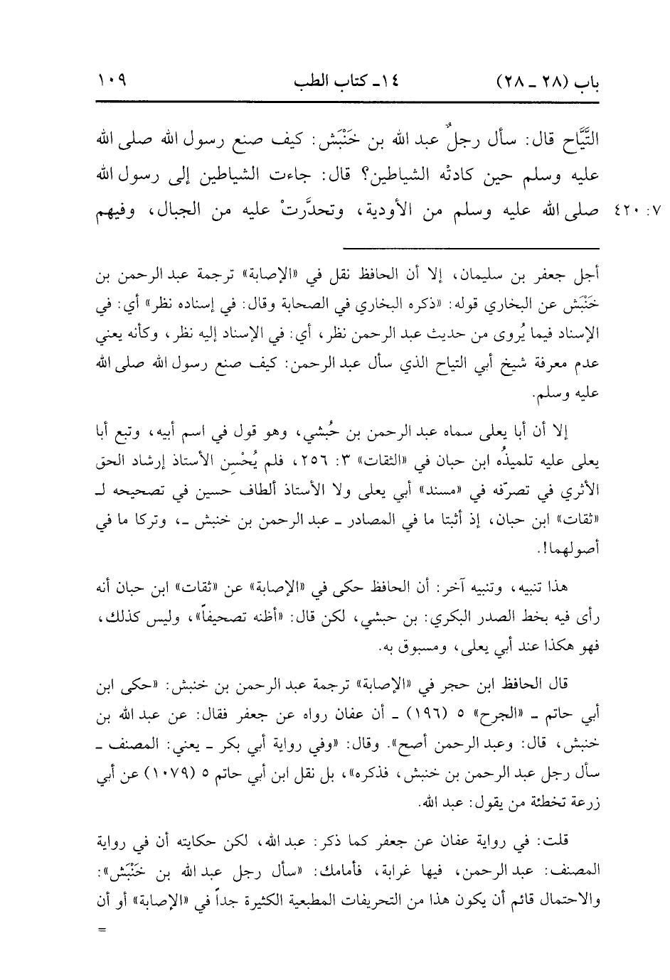 24068- حَدَّثَنَا عَفَّانُ , قَالَ : حدَّثَنَا جَعْفَرُ بْنُ سُلَيْمَانَ ، قَالَ : حَدَّثَنَا أَبُو التَّيَّاحِ ، قَالَ : سَأَلَ رَجُلٌ عَبْدَ اللهِ بْنَ خَنْبَشٍ : كَيْفَ صَنَعَ رَسُولُ اللهِ صَلَّى الله عَلَيْهِ وَسَلَّمَ حِينَ كَادَتْهُ الشَّيَاطِينُ ؟ قَالَ : جَاءَتِ الشَّيَاطِينُ إِلَى رَسُولِ اللهِ صَلَّى الله عَلَيْهِ وَسَلَّمَ مِنَ الأَوْدِيَةِ ، وَتَحَدَّرَتْ عَلَيْهِ مِنَ الْجِبَالِ ، وَفِيهِمْ شَيْطَانٌ مَعَهُ شُعْلَةٌ مِنْ نَارٍ ، يُرِيدُ أَنْ يُحَرِّقَ بِهَا رَسُولَ اللهِ صَلَّى الله عَلَيْهِ وَسَلَّمَ ، فَأُرْعِبَ مِنْهُ ؟ قَالَ جَعْفَرٌ : أَحْسَبُهُ جَعَلَ يَتَأَخَّرُ ، وَجَاءَ جِبْرِيلُ فَقَالَ : يَا مُحَمَّدُ ، قُلْ ، قَالَ : وَمَا أَقُولُ ؟ قَالَ : قُلْ : أَعُوذُ بِكَلِمَاتِ اللهِ التَّامَّاتِ الَّتِي لاَ يُجَاوِزُهُنَّ بَرٌّ ، وَلاَ فَاجِرٌ مِنْ شَرِّ مَا خَلَقَ ، وَذَرَأَ وَبَرَأَ ، وَمِنْ شَرِّ مَا يَنْزِلُ مِنَ السَّمَاءِ ، وَمِنْ شَرِّ مَا يَعْرُجُ فِيهَا ، وَمِنْ شَرِّ مَا ذَرَأَ فِي الأَرْضِ ، وَمِنْ شَرِّ مَا يَخْرُجُ مِنْهَا ، وَمِنْ شَرِّ فِتَنِ اللَّيْلِ وَالنَّهَارِ ، وَمِنْ شَرِّ كُلِّ طَارِقٍ إِلاَّ طَارِقًا يَطْرُقُ بِخَيْرٍ يَا رَحْمَنُ ، قَالَ : فَطُفِئَتْ نَارُ الشَّيَاطِينَ ، وَهَزَمَهُمَ اللَّهُ. (7/419).