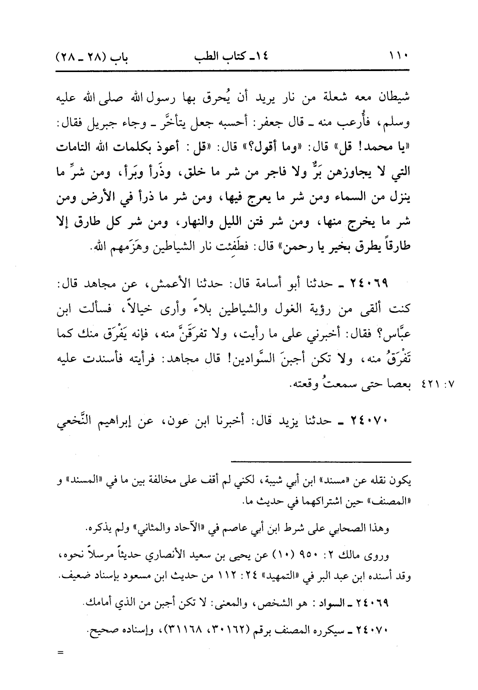 24069- حَدَّثَنَا أَبُو أُسَامَةَ ، قَالَ : حَدَّثَنَا الأَعْمَشِ ، عَنْ مُجَاهِدٍ ، قَالَ : كُنْتُ أَلْقَى مِنْ رُؤْيَةِ الْغُولِ وَالشَّيَاطِينِ بَلاَءً وَأَرَى خَيَالاً ، فَسَأَلْتُ ابْنَ عَبَّاسٍ ؟ فَقَالَ : أَخْبِرنِي عَلَى مَا رَأَيْتَ ، وَلاَ تُفْرَقنَّ مِنْهُ ، فَإِنَّهُ يَفْرَقُ مِنْكَ كَمَا تَفْرَقُ مِنْهُ ، وَلاَ تَكُنْ أَجْبَنَ السَّوَادَيْنِ ، قَالَ مُجَاهِدٌ : فَرَأَيْتُهُ فَأَسْنَدْتُ عَلَيْهِ بِعَصَا حَتَّى سَمِعْتُ وَقْعَتَهُ. (7/420).
