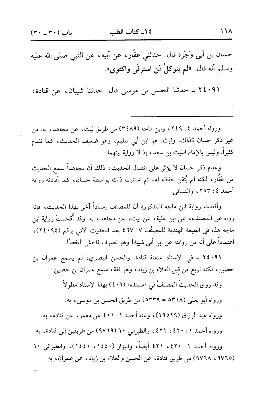 24091- حَدَّثَنَا الْحَسَنُ بْنُ مُوسَى , قَالَ : حدَّثَنَا شَيْبَانُ ، عَنْ قَتَادَةَ ، عَنِ الْحَسَنِ ، عَنْ عِمْرَانَ بْنِ حُصَيْنٍ ، عَنِ ابْنِ مَسْعُودٍ : قَالَ : تَحَدَّثْنَا عِنْدَ رَسُولِ اللهِ صَلَّى الله عَلَيْهِ وَسَلَّمَ ذَاتَ لَيْلَةٍ ، فَقَالَ النَّبِيُّ صَلَّى الله عَلَيْهِ وَسَلَّمَ : سَبْعُونَ أَلْفًا يَدْخُلُونَ الْجَنَّةَ لاَ حِسَابَ عَلَيْهِمْ : الَّذِينَ لاَ يَكْتَوُونَ ، وَلاَ يَسْتَرْقُونَ ، وَلاَ يَتَطَيَّرُونَ ، وَعَلَى رَبِّهِمْ يَتَوَكَّلُونَ. (7/427).