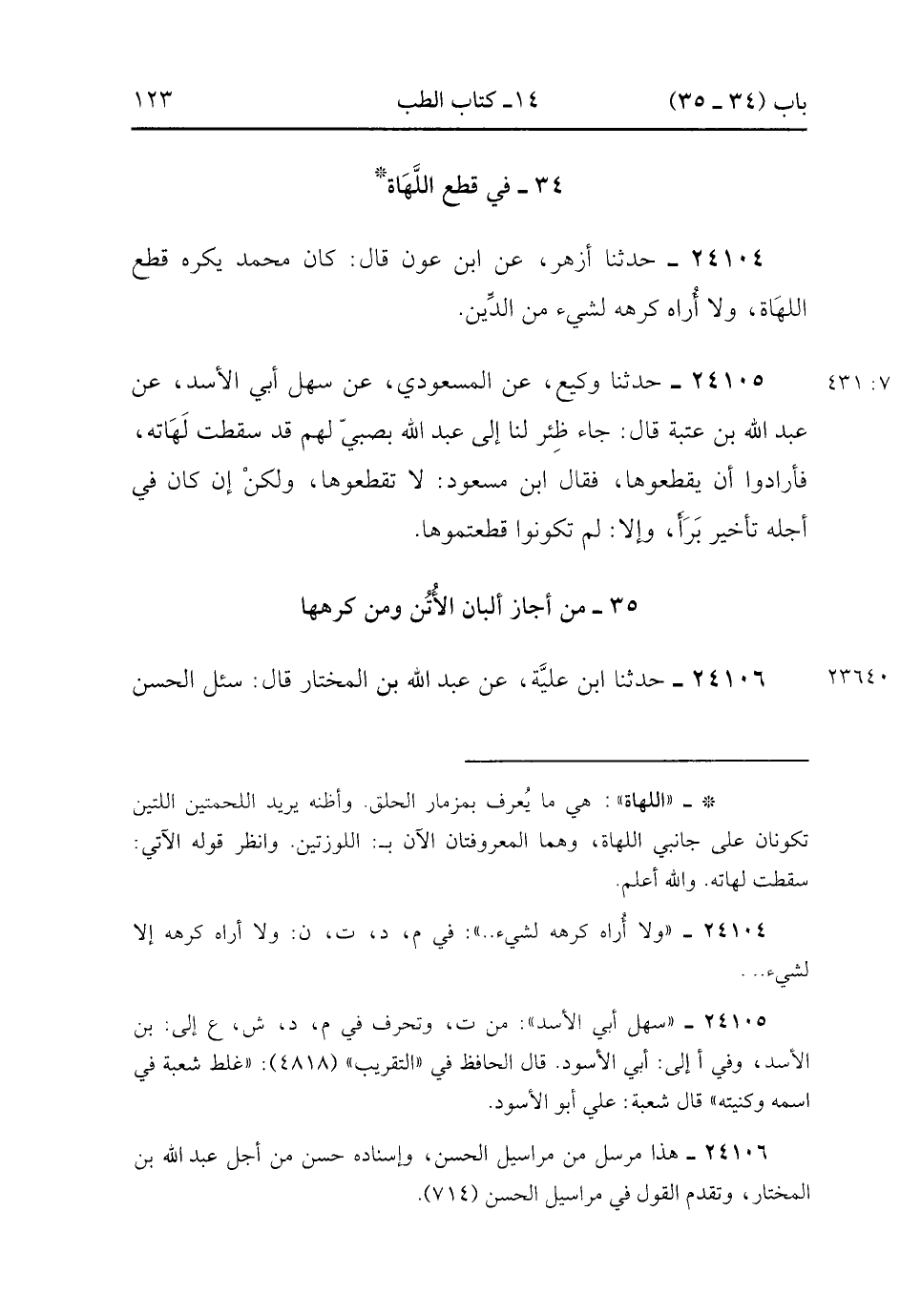24104- حَدَّثَنَا أَزْهَرُ ، عَنِ ابْنِ عَوْنٍ ، قَالَ : كَانَ مُحَمَّدٌ يَكْرَهُ قَطْعَ اللَّهَاةِ ، وَلاَ أُرَاهُ كَرِهَهُ لِشَيْءٍ مِنَ الدِّينِ. (7/430).