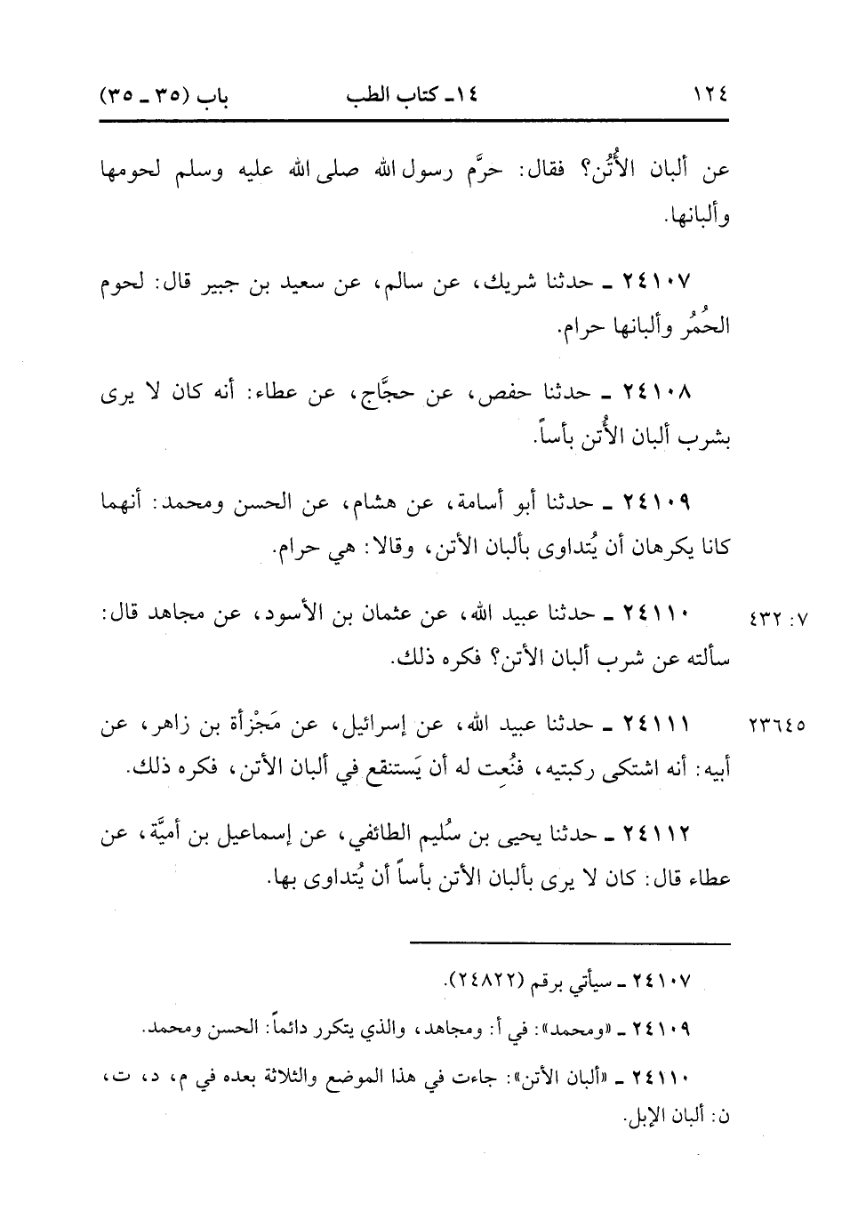 24109- حَدَّثَنَا أَبُو أُسَامَةَ ، عَنْ هِشَامٍ ، عَنِ الْحَسَنِ ، وَمُحَمَّدٍ ؛ أَنَّهُمَا كَانَا يَكْرَهَانِ أَنْ يُتَدَاوَى بِأَلْبَانِ الأُتُنِ ، وَقَالاَ : هِيَ حَرَامٌ.