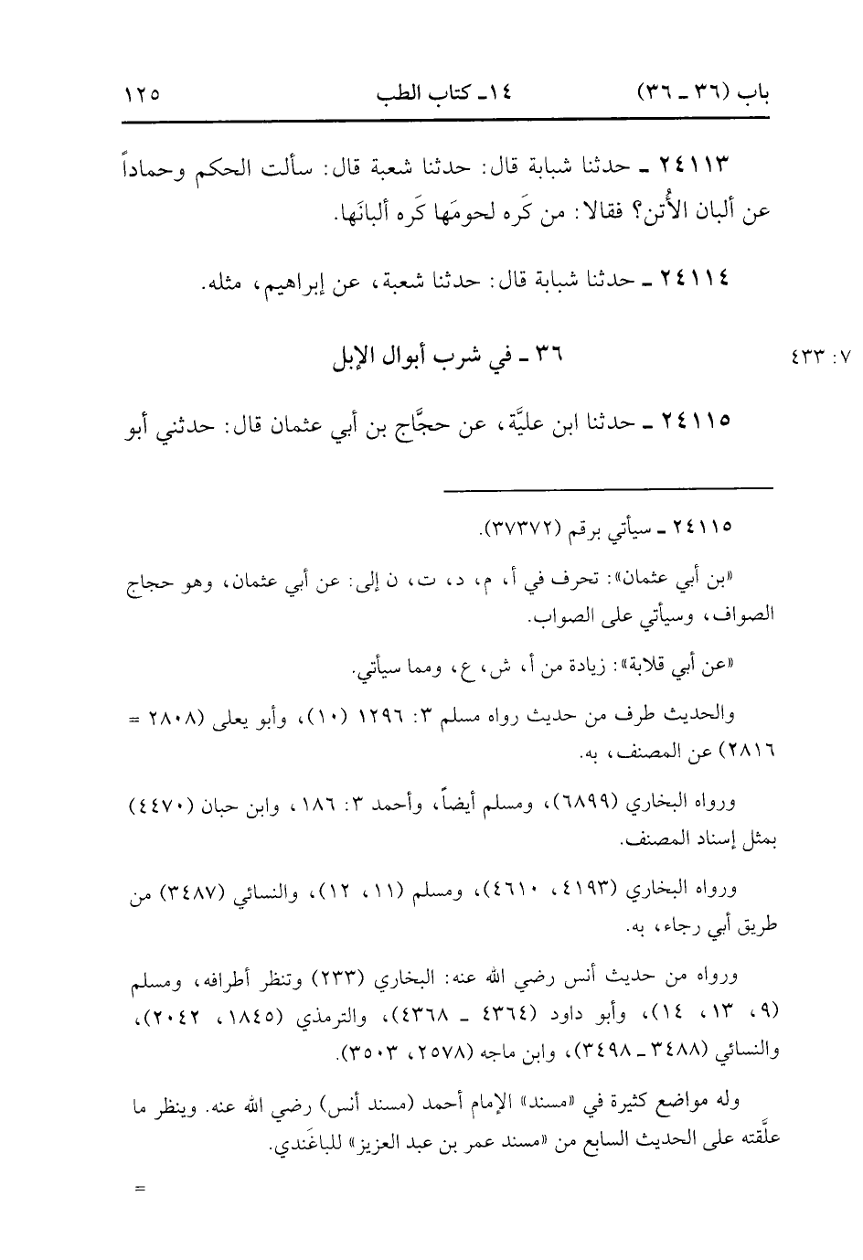 24115- حَدَّثَنَا ابْنُ عُلَيَّةَ ، عَنْ حَجَّاجِ بْنِ أَبِي عُثْمَانَ ، قَالَ : حدَّثَنِي أَبُو رَجَاءٍ ، مَوْلَى أَبِي قِلاَبَةَ ، عَنْ أَبِي قِلاَبَةَ ، قَالَ : حَدَّثَنِي أَنَسُ بْنُ مَالِكٍ ؛ أَنَّ نَفَرًا مِنْ عُكَلٍ ثَمَانِيَةً قَدِمُوا عَلَى رَسُولِ اللهِ صَلَّى الله عَلَيْهِ وَسَلَّمَ ، فَبَايَعُوهُ عَلَى الإِسْلاَمِ ، فَاسْتَوْخَمُوا الأَرْضَ ، وَسَقِمَتْ أَجْسَادُهُمْ ، فَشَكَوْا ذَلِكَ إِلَى رَسُولِ اللهِ صَلَّى الله عَلَيْهِ وَسَلَّمَ ، فَقَالَ : أَلاَ تَخْرُجُون مَعَ رَاعِينَا فِي إِبِلِهِ فَتُصِيبُوا مِنْ أَبْوَالِهَا وَأَلْبَانِهَا ؟ قَالُوا : بَلَى ، فَخَرَجُوا فَشَرِبُوا مِنْ أَبْوَالِهَا وَأَلْبَانِهَا. (7/433).