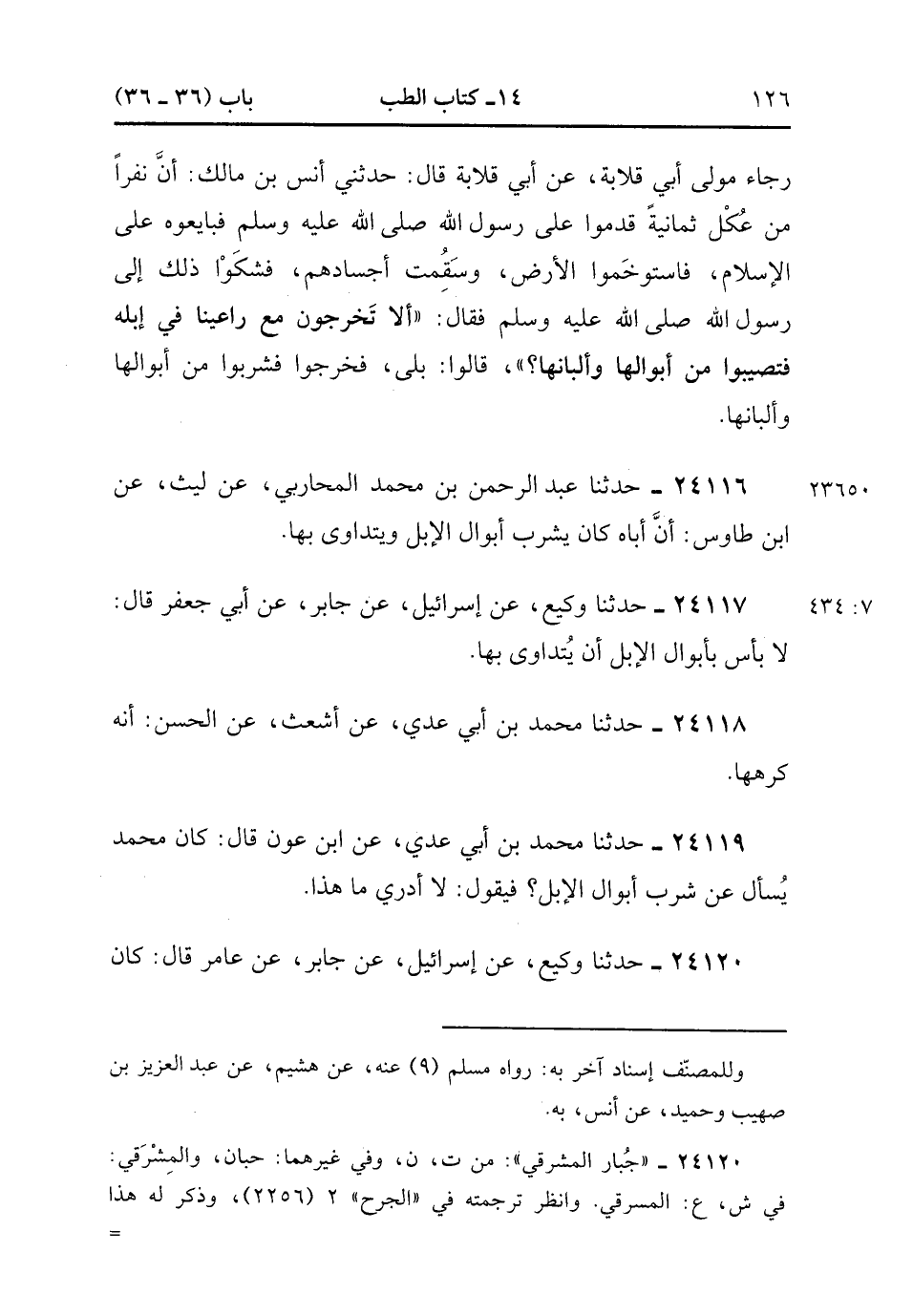 24120- حَدَّثَنَا وَكِيعٌ ، عَنْ إِسْرَائِيلَ ، عَنْ جَابِرٍ ، عَنْ عَامِرٍ ، قَالَ : كَانَ جُبَارٌ الْمَشْرَقِيُّ يَصِفُ أَبْوَالَ الإِبِلِ ، وَلَوْ كَانَ بِهِ بَأْسٌ لَمْ يَصِفْهَا. (7/434).
