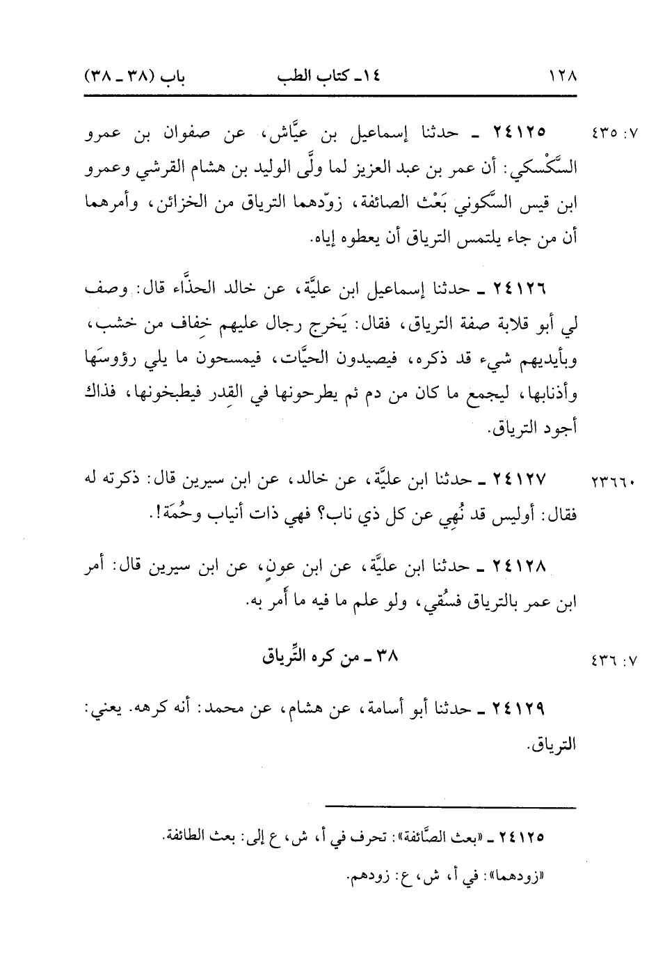 24129- حَدَّثَنَا أَبُو أُسَامَةَ ، عَنْ هِشَامٍ ، عَنْ مُحَمَّدٍ ؛ أَنَّهُ كَرِهَهُ ، يَعْنِي التِّرْيَاقَ. (7/436).