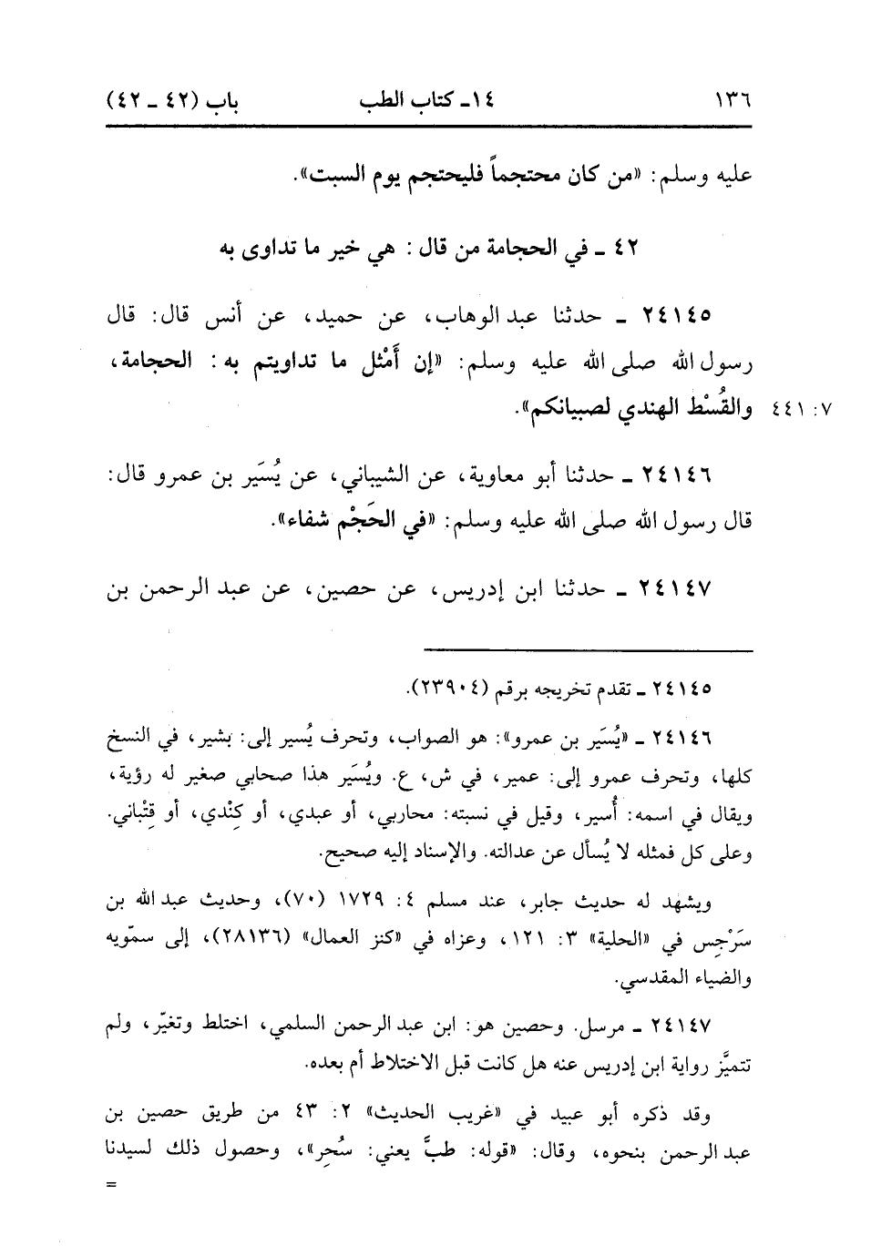 24145- حَدَّثَنَا عَبْدُ الْوَهَّابِ ، عَنْ حُمَيْدٍ ، عَنْ أَنَسٍ ، قَالَ : قَالَ رَسُولُ اللهِ صَلَّى الله عَلَيْهِ وَسَلَّمَ : إِنَّ أَمْثَلَ مَا تَدَاوَيْتُمْ بِهِ ، الْحِجَامَةُ ، وَالْقُسْطُ الْهِنْدِيُّ لِصِبْيَانِكُمْ. (7/440).