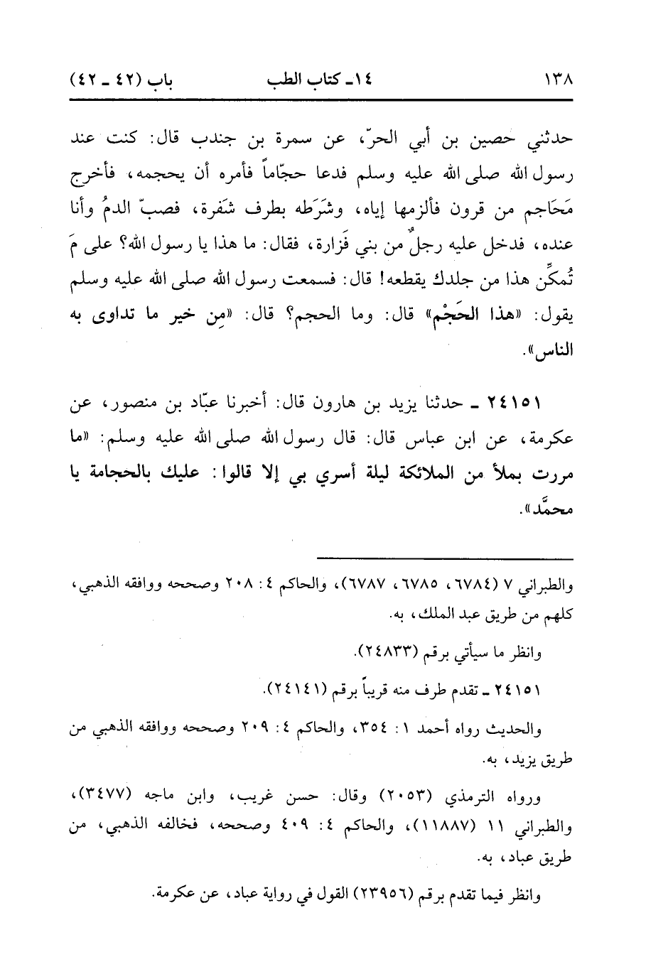 24151- حَدَّثَنَا يَزِيدُ بْنُ هَارُونَ , قَالَ : أَخْبَرَنَا عَبَّادُ بْنُ مَنْصُورٍ ، عَنْ عِكْرِمَةَ ، عَنِ ابْنِ عَبَّاسٍ ، قَالَ : قَالَ رَسُولُ اللهِ صَلَّى الله عَلَيْهِ وَسَلَّمَ : مَا مَرَرْتُ بِمَلأَ مِنَ الْمَلاَئِكَةِ لَيْلَةَ أُسْرِيَ بِي إِلا َقَالُوا : عَلَيْكَ بِالْحِجَامَةِ يَا مُحَمَّدُ. (7/442).