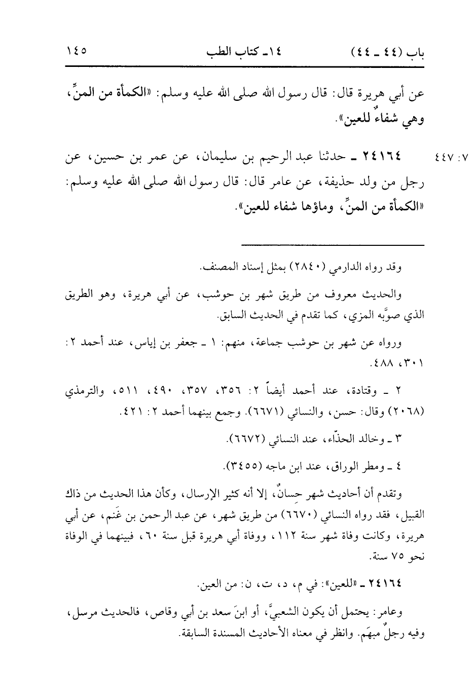 24164- حَدَّثَنَا عَبْدُ الرَّحِيمِ بْنُ سُلَيْمَانَ ، عَنْ عُمَرَ بْنِ حُسَيْنٍ ، عن رَجُلٍ مِنْ وَلَدِ حُذَيْفَةَ ، عَنْ عَامِرٍ ، قَالَ : قَالَ رَسُولُ اللهِ صَلَّى الله عَلَيْهِ وَسَلَّمَ : الْكَمْأَةُ مِنَ الْمَنِّ ، وَمَاؤُهَا شِفَاءٌ لِلْعَيْنِ. (7/447).