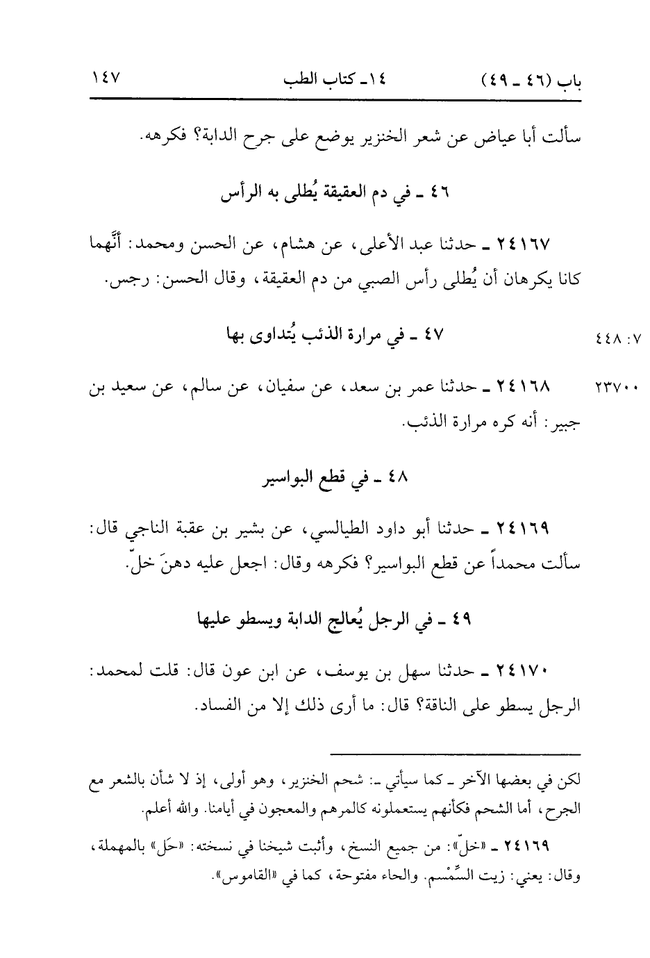 24169- حَدَّثَنَا أَبُو دَاوُدَ الطَّيَالِسِيُّ ، عَنْ بَشِيرِ بْنِ عُقْبَةَ النَّاجِي ، قَالَ : سَأَلْتُ مُحَمَّدًا عَنْ قَطْعِ الْبَوَاسِيرِ ؟ فَكَرِهَهُ ، وَقَالَ : اجْعَلْ عَلَيْهِ دُهْنَ خَلٍّ.